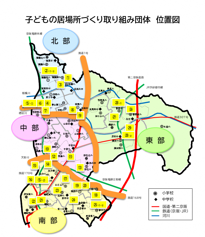 | 23 | 南部 | 子どもは未来 キッズダイナー (子どもは未来 キッズダイナー) | 枚方市立五常小学校 (香里ケ丘6-9) | 五常 | 100人 | 第3金曜日 16:00~20:00 | 中学生以下:無料 大人:300円 | 090-8539-7120 sojunning@gmail.com | (PDF形式、724.03KB) | |
