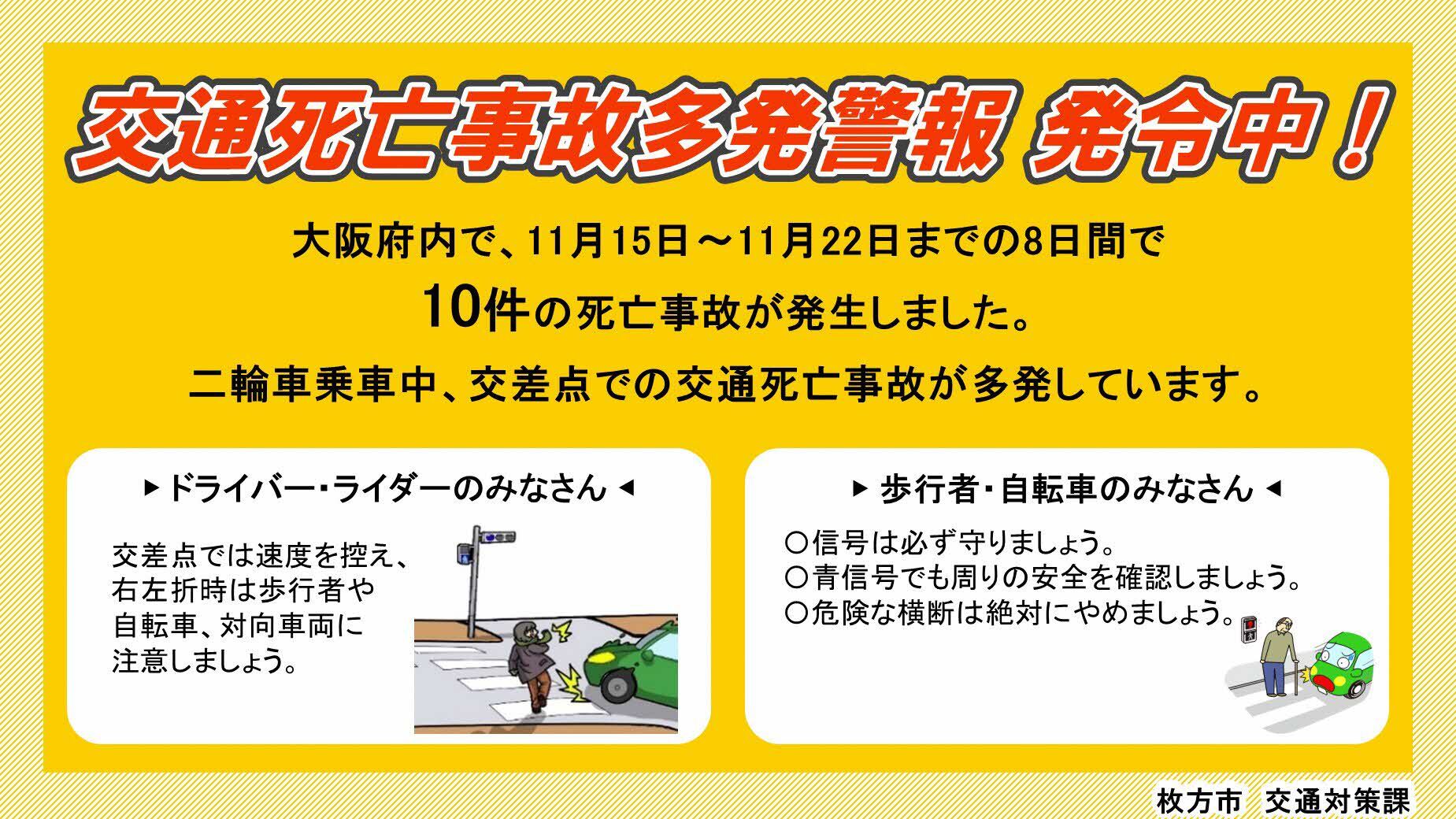 11月15日(土曜日)から22日(土曜日)の8日間で、交通死亡事故が10件(死者数11人)発生し、大阪府は交通死亡事故多発警報を発令しました。