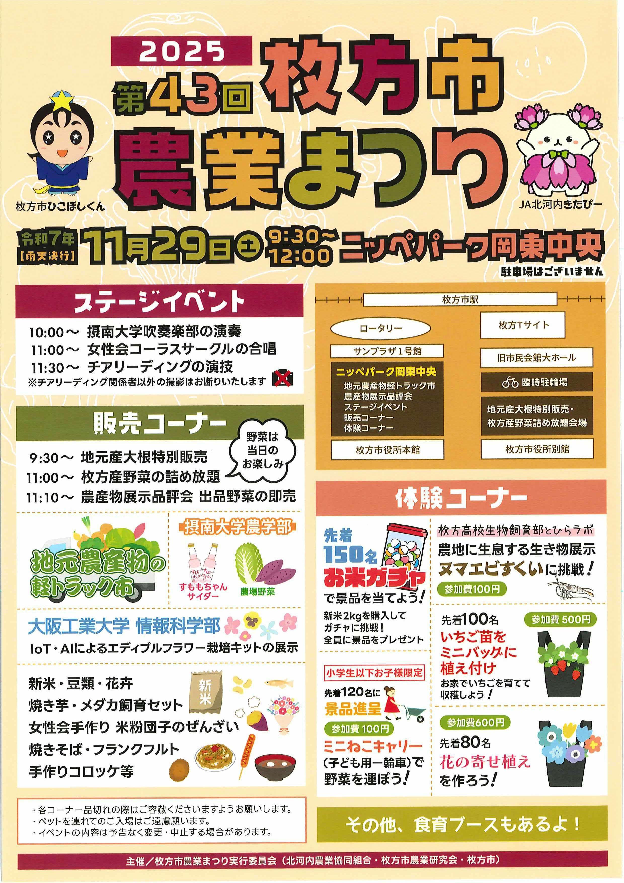 枚方市農業まつりは、北河内農業協同組合、枚方市農業研究会及び枚方市で構成する枚方市農業まつり実行委員会が主催するイベントです。今年の枚方市農業まつりは、地元農産物の軽トラック市・枚方産大根特別販売・枚方産野菜の詰め放題など新鮮野菜の販売、米粉団子のぜんざい・コロッケ・焼き芋などの模擬店。お米ガチャ・ミニねこキャリー・ヌマエビすくい・いちご苗のミニバッグへの植え付け・花の寄せ植えなどの体験コーナーのほか、摂南大学吹奏楽部の演奏などのステージイベントもあり、大人から子どもまで幅広い年代で楽しめるイベントですので、是非ともご来場ください。