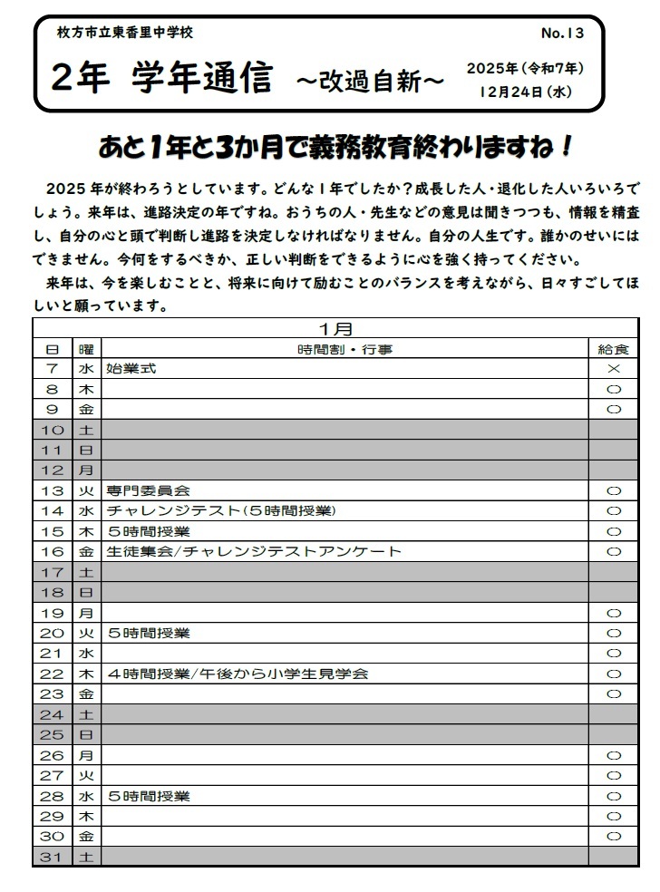 枚方市役所 教育機関(市立中学校19校) 東香里中学校