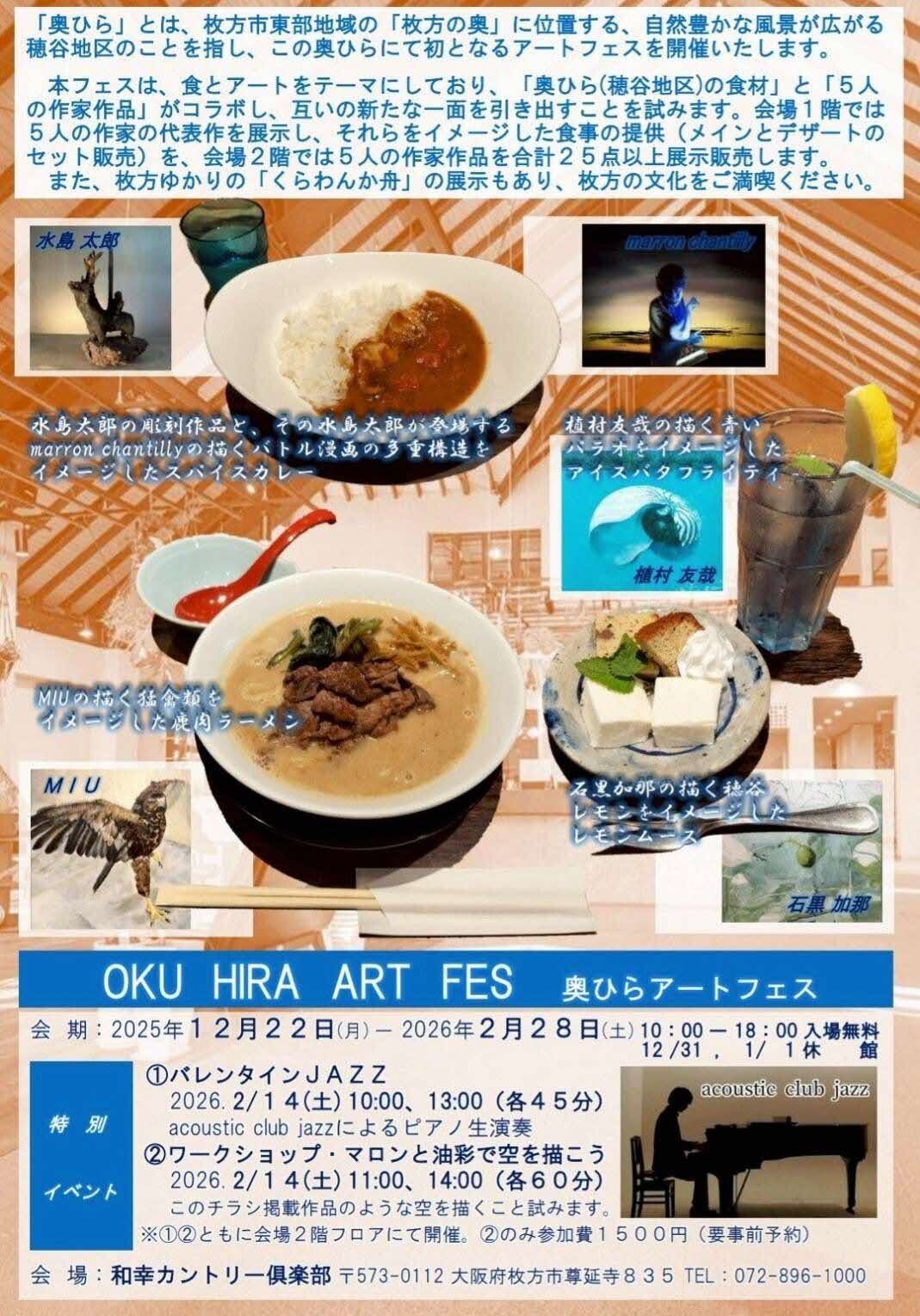 | 249 | 2025/12/22(月)~2026/2/28(土) | 奥ひらアートフェス | 食とアートをテーマに、「奥ひら(穂谷地区)の食材」と「5人の作家作品」がコラボ。2月14日(土)にはワークショップも(予約・参加費要)。 | 和幸カントリー倶楽部内 | 奥ひら実行委員会・(特非)枚方文化観光協会 | 奥ひらアートフェス(1)(2) |