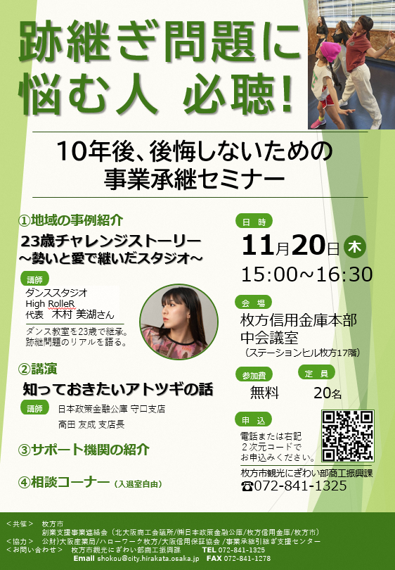 円滑な事業承継に向けた準備や課題について考えてみませんか?トークセッションでは、20代でダンス教室を第3者承継した若手の跡継ぎ者が登壇し、体験談をご披露いただきます。講演後、相談コーナーでお気軽に相談もお受けします。