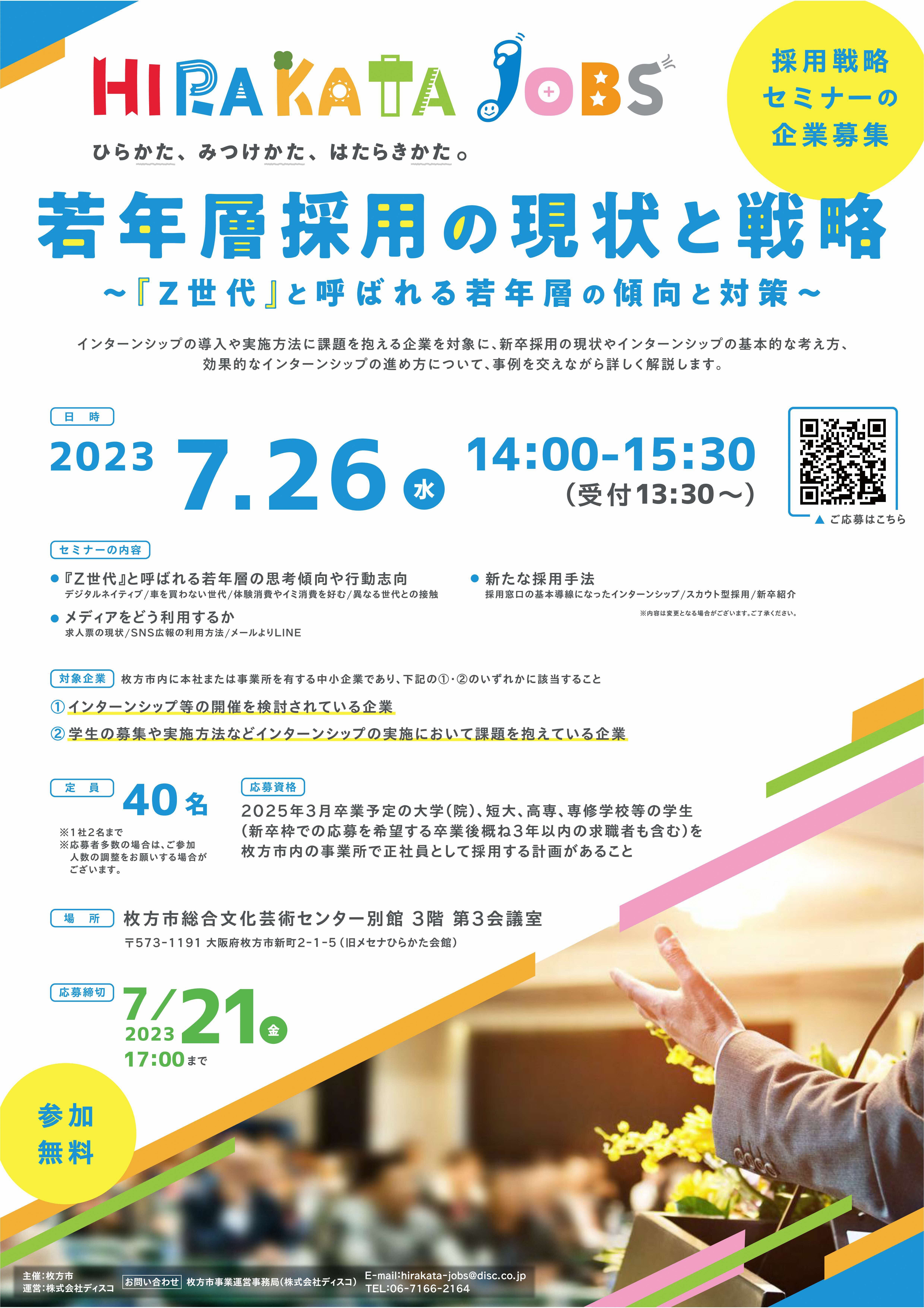令和5年7月 | 7日(金) | 12:00~16:00 | 枚方市総合文化芸術センター別館 6階 大会議室 | 20社 | 採用(内定)/2名 |