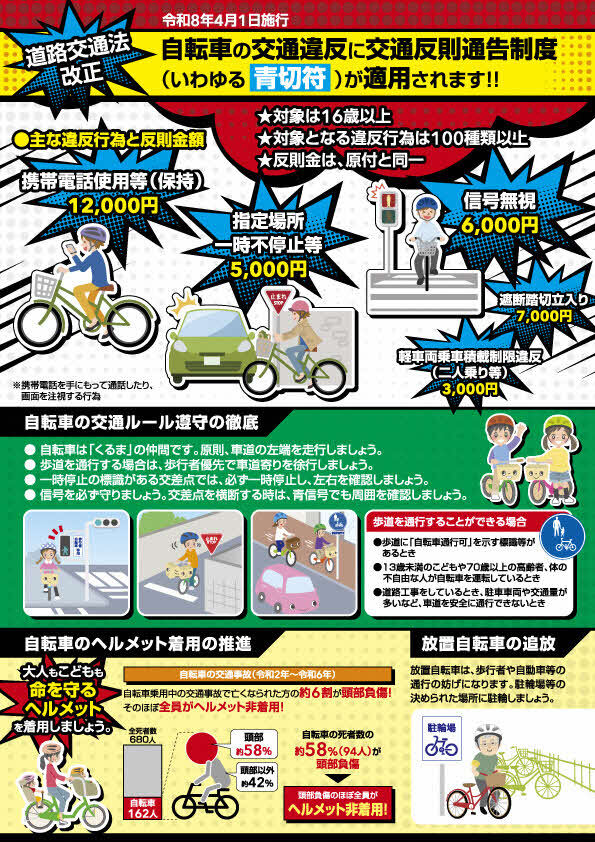 改正道路交通法の施行により、令和5年4月1日から全ての年齢層で自転車利用者のヘルメット着用が努力義務化されています。
