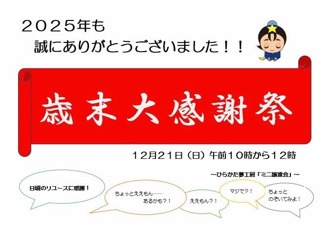 | 11月3日(日) | ひらエコまつり | ・リユース啓発 「再利用陶器類大譲渡会」 「特別車両展示」 「リユース品無料抽選会」 ・リサイクル 「ひらかた夢工房各種販売」 「洗濯機解体ショー」 ・ワークショップ 「プチプチポンチョ作り」 「木製ガーデンピック作り」 「生ごみ堆肥化講習会」 「EMぼかし作り」 ※その他 「家庭用電動生ごみ処理機展示」 「塵芥収集車・重機類乗車体験」 |