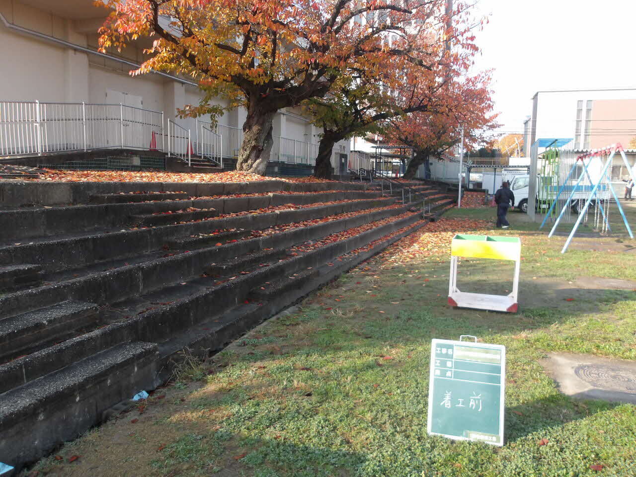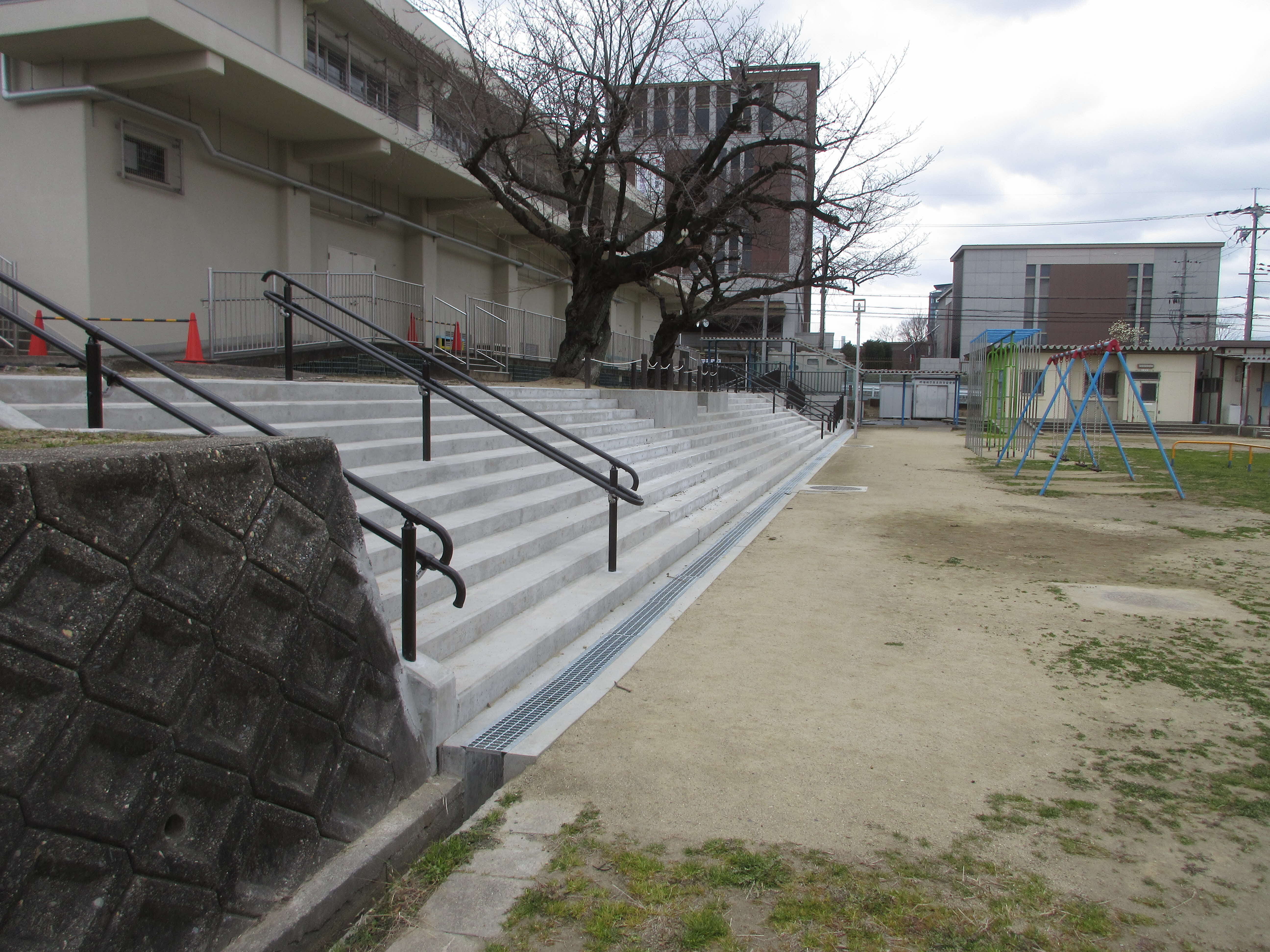 体育館と運動場の間の擁壁、階段、スロープ等を改修しました。
