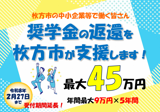 枚方市では、市内中小企業等の人材確保及び人材の定着を目的に、若年者の経済的負担の軽減を図るとともに、安定した就労を支援する若年者奨学金返還支援補助金を実施します。