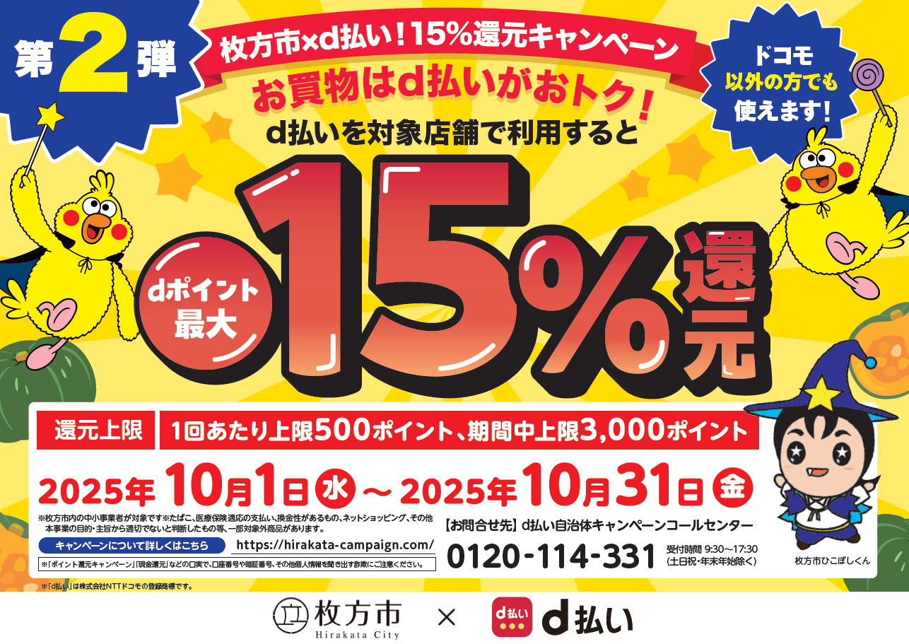 【第2弾】(10/1~10/31まで)枚方市×d払い!15%還元キャンペーンの実施
