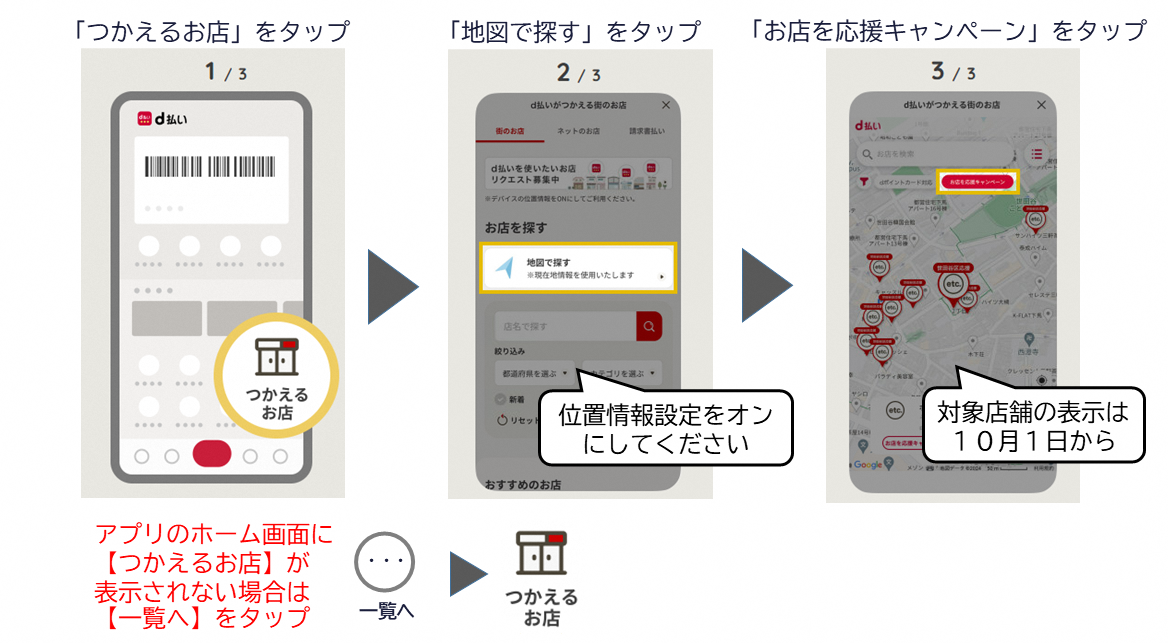対象店舗はd払いアプリ内の地図で確認ができます。(対象店舗は10月1日以降に表示されます。対象店舗の内、一部は未掲載の場合があります。)