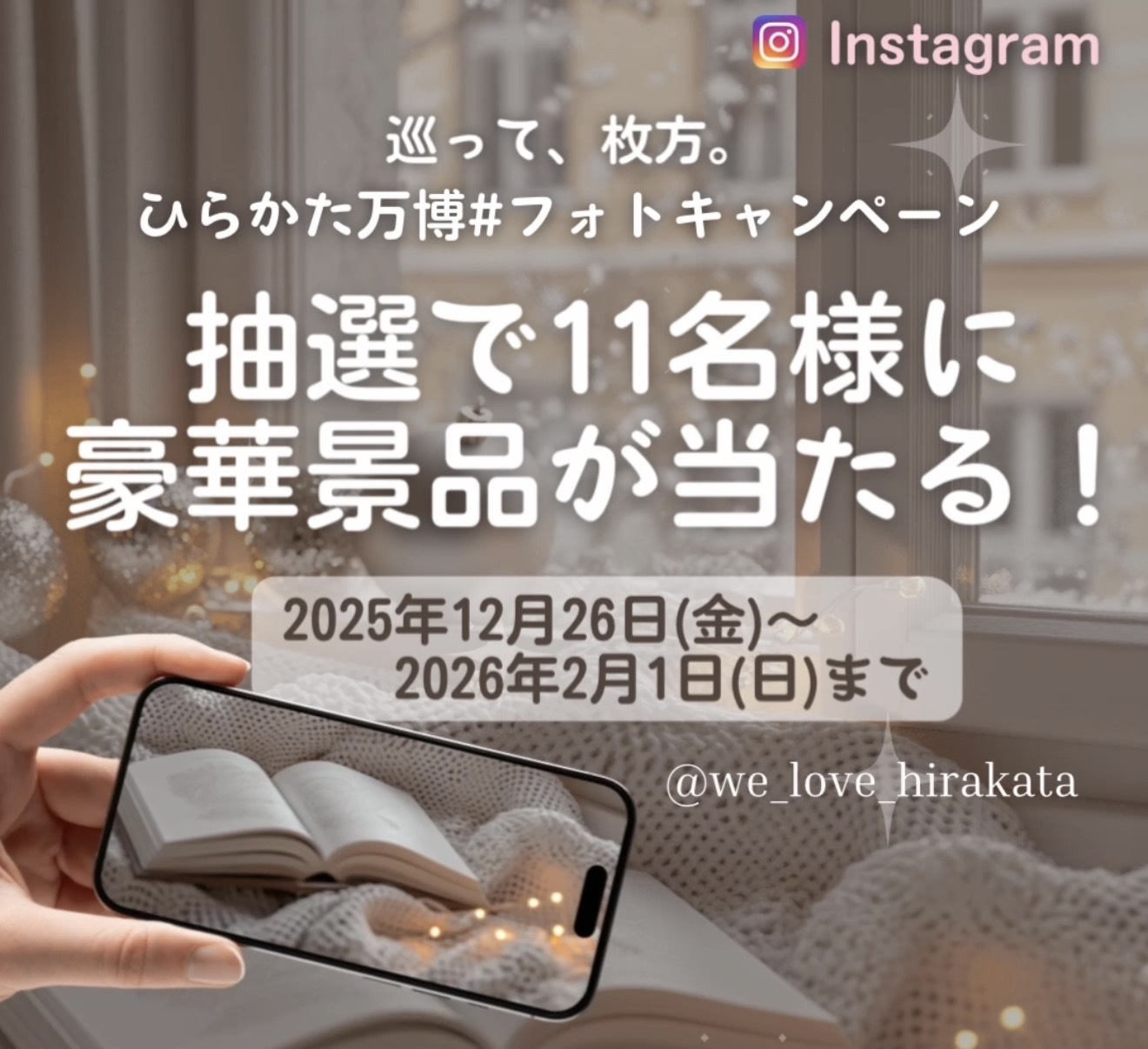 ひらかた万博(別ウインドウで開く)の一環として、市の魅力を広く発信するため、公式Instagramアカウント(@we_love_hirakata(別ウインドウで開く))を活用したフォトキャンペーン「巡って、枚方。~ひらかた万博#フォトキャンペーン~」を開催します。