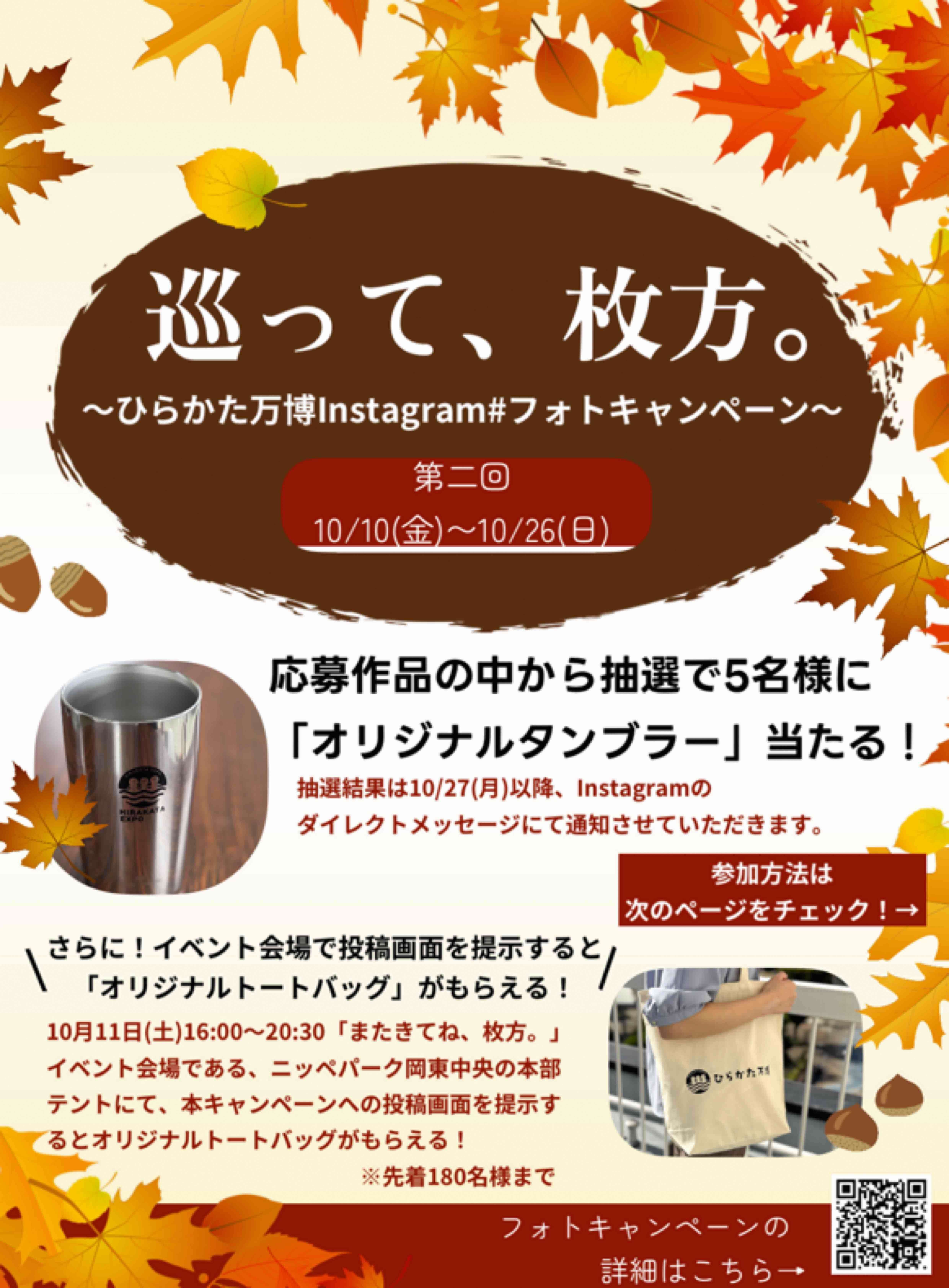 ・投稿時のキャプションに撮影場所を記載し、ハッシュタグに「#めぐひら」と「#ひらかた万博」をつけて投稿してください。