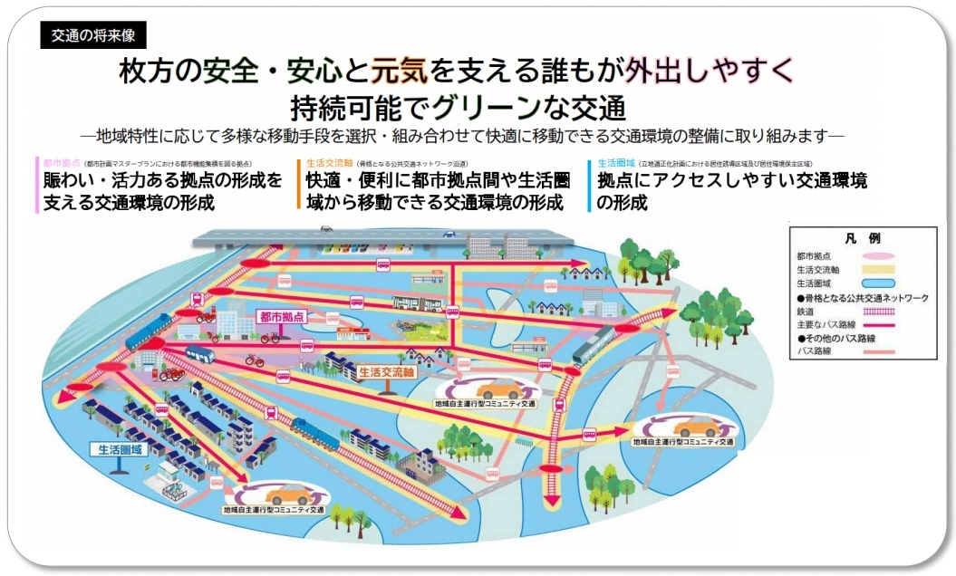 本市では、令和7年3月に改定した「枚方市総合交通計画」において、地域の足の確保を施策目標に掲げており、公共交通を補完する移動手段の確保として、鉄道やバスなどの公共交通の本数が少ない、あるいは全く運行していないなど、移動に困っている人の移動手段の確保を目指して、地域が主体となり、既存公共交通を補完する「地域自主運行型コミュニティ交通」の導入を進められるよう、「地域主体による新たな移動手段導入の手引き」を策定しました。