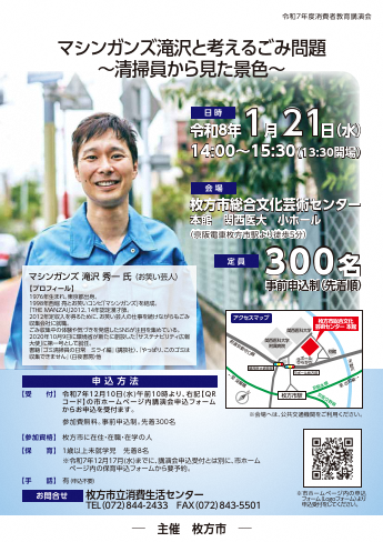 令和7年度消費者教育講演会 令和8年1月21日(水) 「マシンガンズ滝沢と考えるごみ問題~清掃員から見た景色~」を開催します!