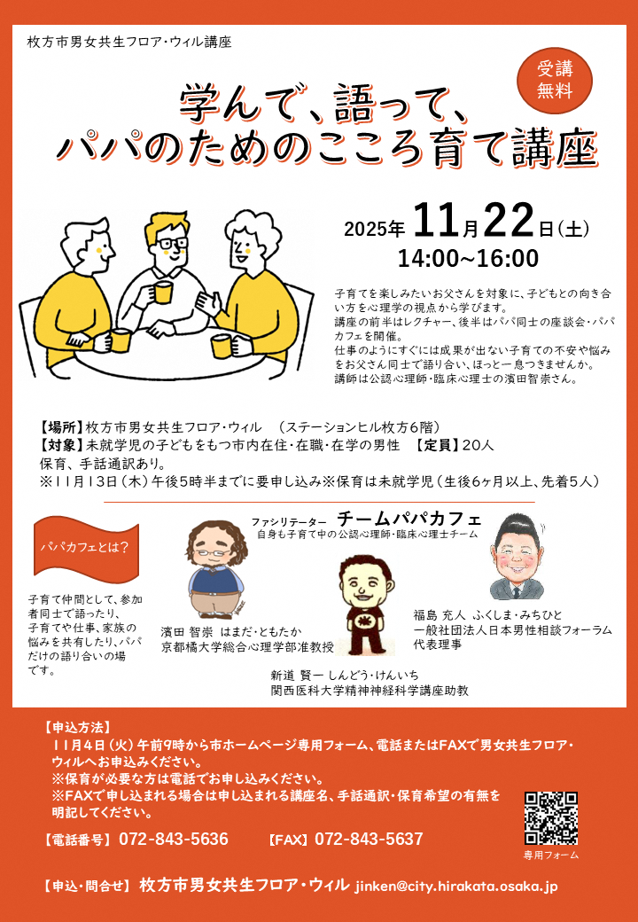 子育てを楽しみたい男性を対象に、講座の前半は子どもとの向き合い方を心理学の視点から学びます。後半は、参加者同士で座談会・パパカフェを開催します。