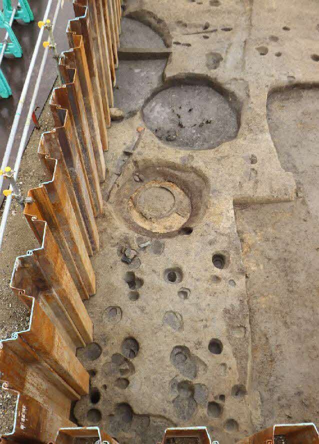 今回の調査では、平安時代後期から室町時代頃と推定される建物跡や井戸、大規模な区画溝が発見され、中世の町の一画が確認されました。この町は、後の河内街道や淀川へアクセスできる地域としての開発過程を示していると考えられます。