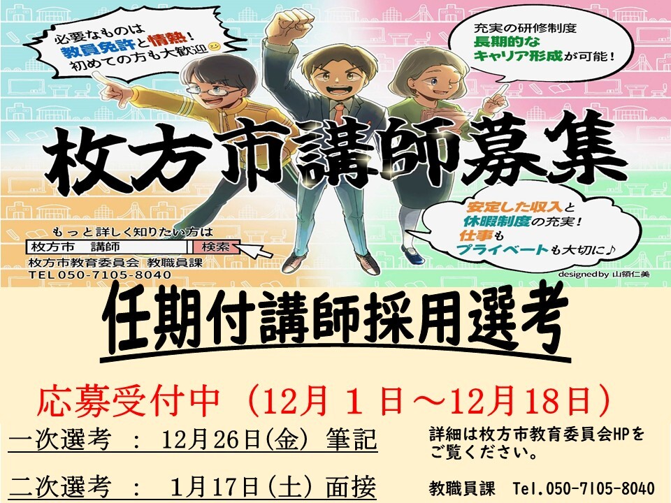 【令和8年(2026年)4月1日採用】枚方市教育委員会任期付職員採用選考(小学校講師)の実施について