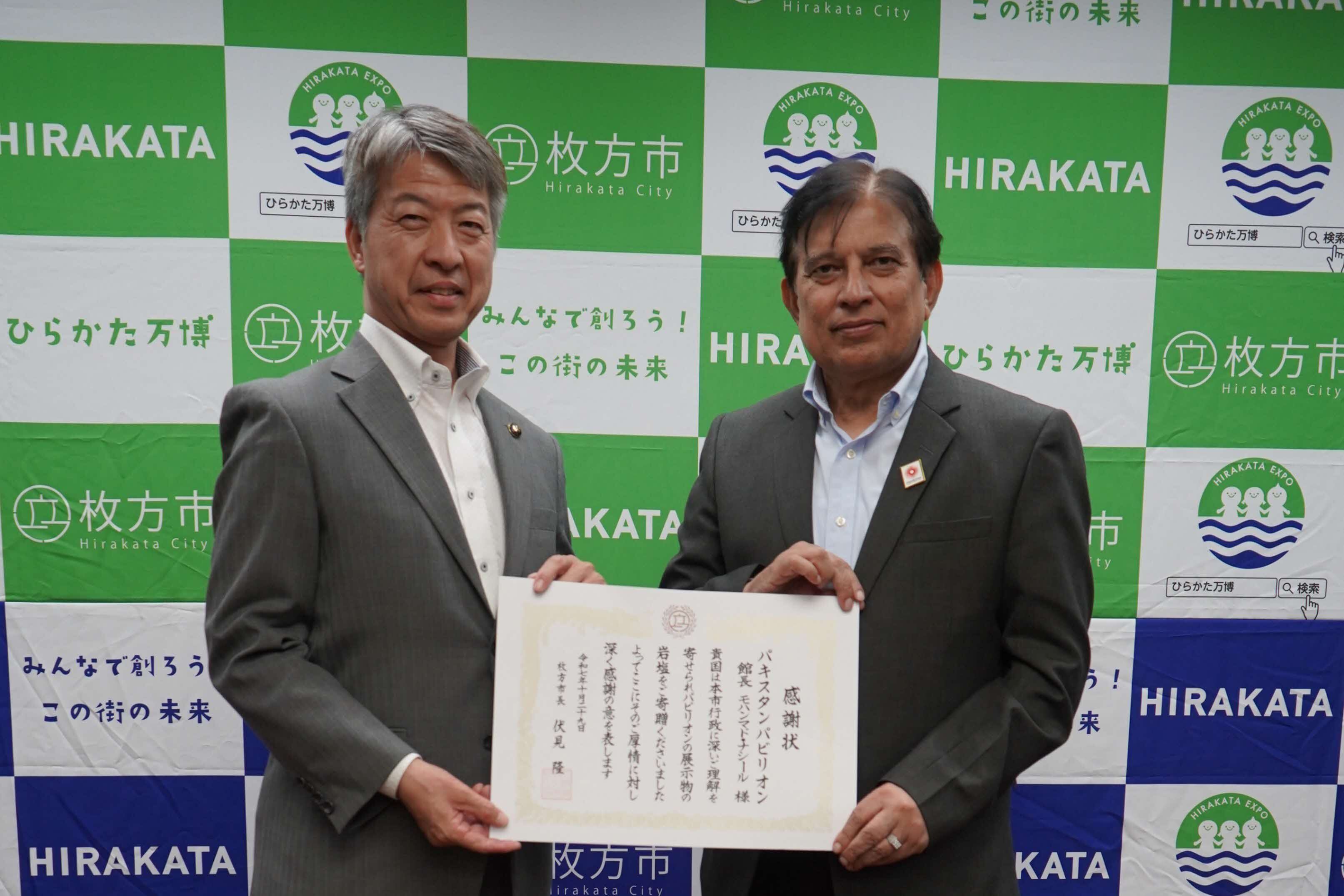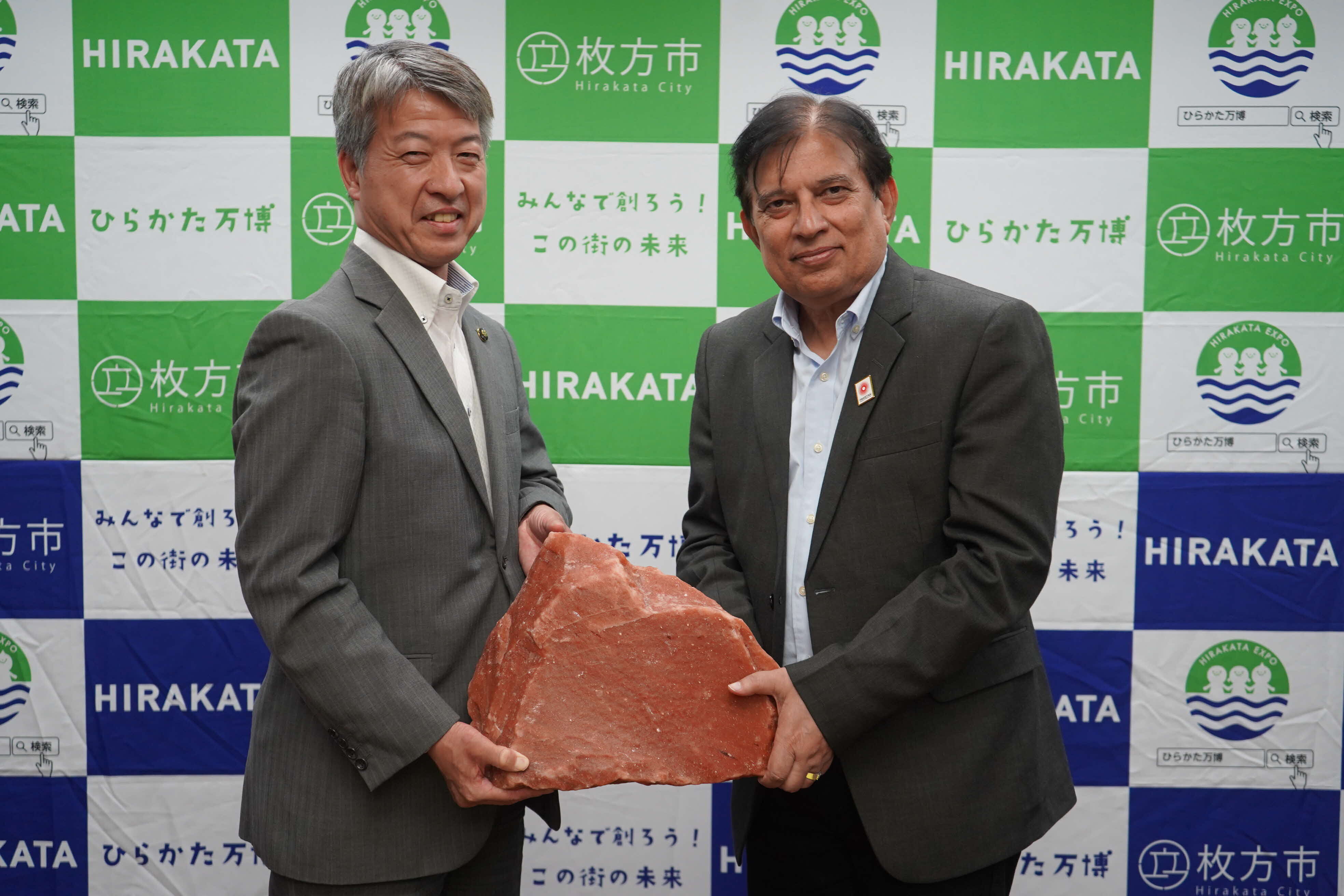令和7年10月29日(水)、大阪・関西万博の共同館・コモンズDで人気を集めたパキスタンパビリオンの岩塩が枚方市に寄贈され、伏見市長からモハンマド・ナシール館長に感謝状が手渡されました。