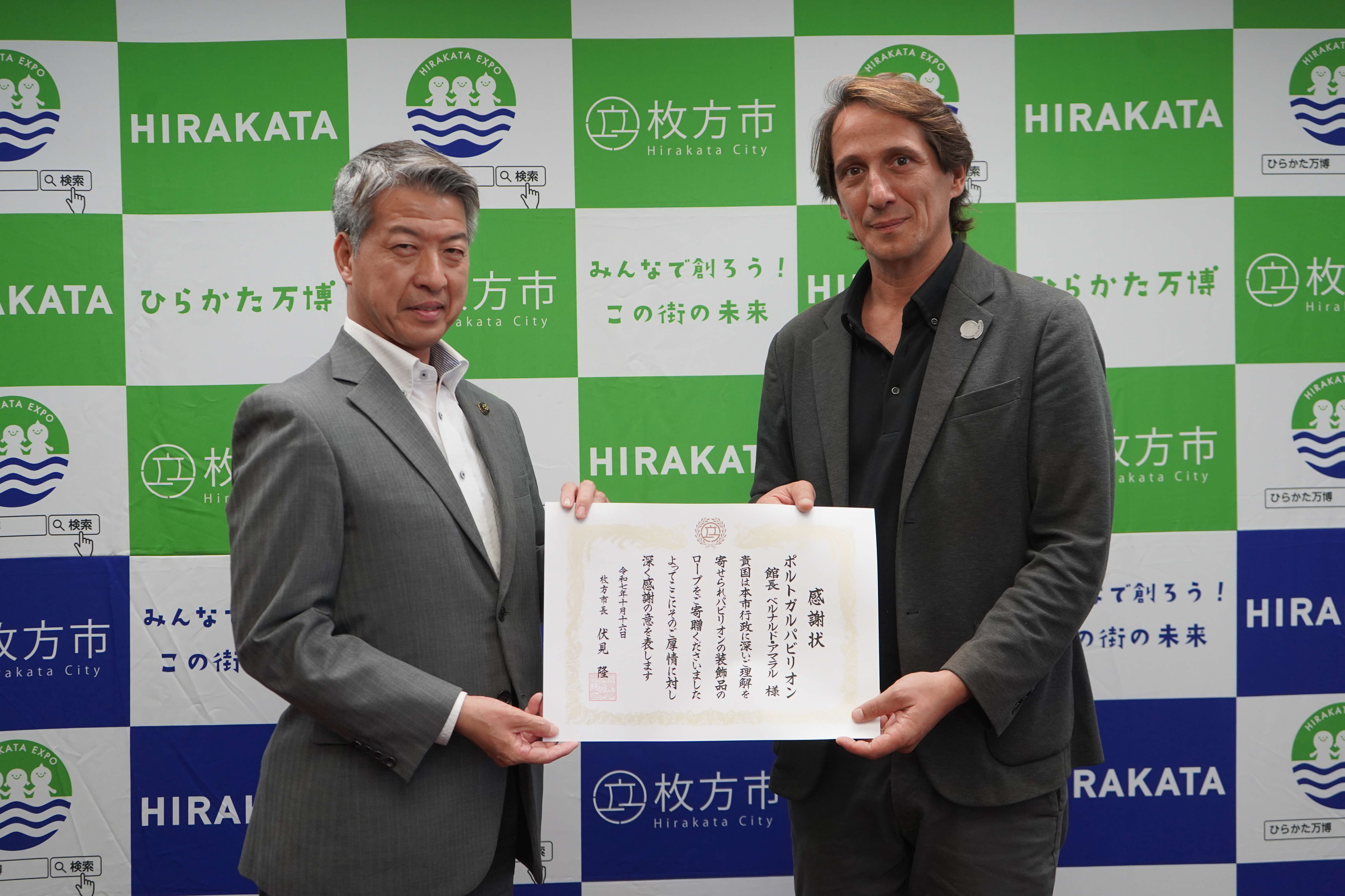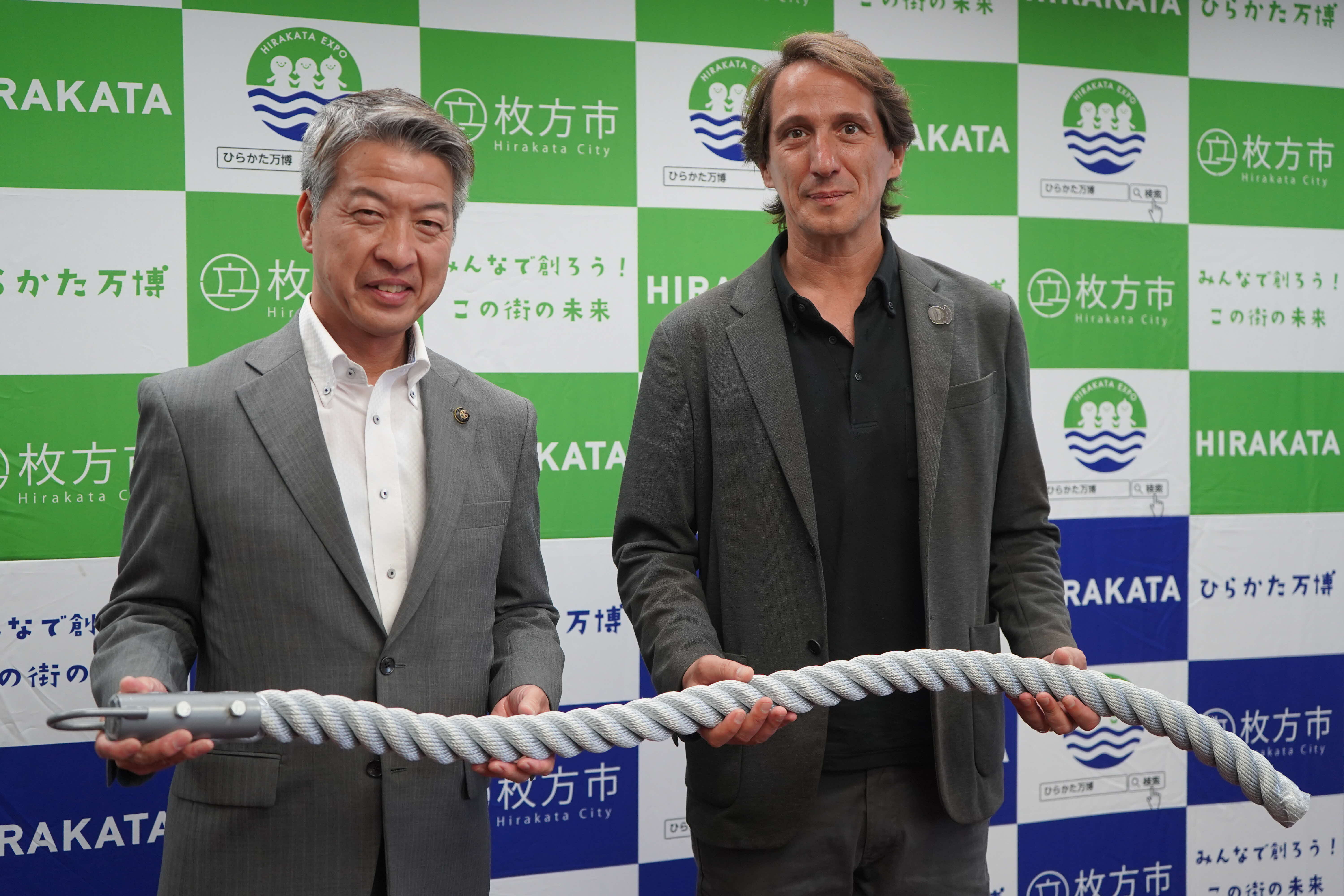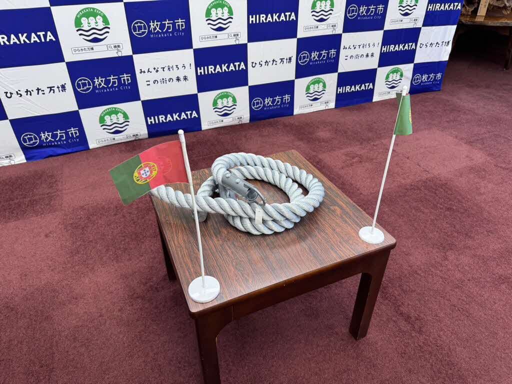 令和7年10月16日(木)、大阪・関西万博のポルトガル館に使用されたロープの一部が枚方市に寄贈され、伏見市長からベルナルド・アマラル館長に感謝状が手渡されました。