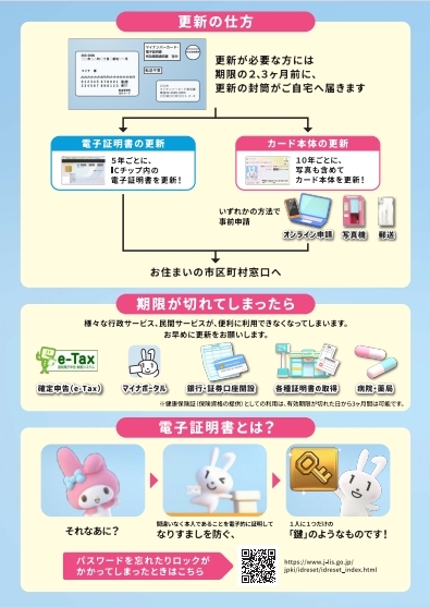 有効期限の2か月から3か月前を目途に、地方公共団体情報システム機構(J-LIS)から、有効期限をお知らせする「有効期限通知書」が同封された封筒がご自宅に送付されますので、忘れずにお早目の更新手続きをお願いします。手続きは、市民課です。