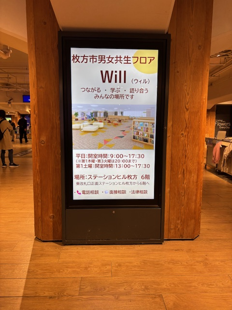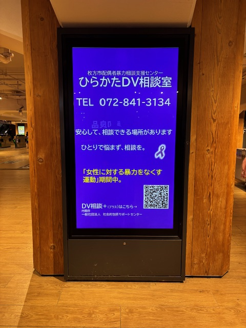 女性が抱える悩みの相談窓口として、「ひらかたDV相談室」と「男女共生フロア・ウィル」の駅デジタルサイネージを実施しました。