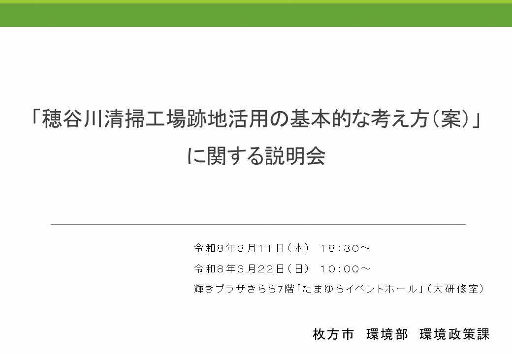 新たな拠点形成に必要な機能を整理した「穂谷川清掃工場跡地活用の基本的な考え方(案)」につきまして、市民説明会を開催いたします。