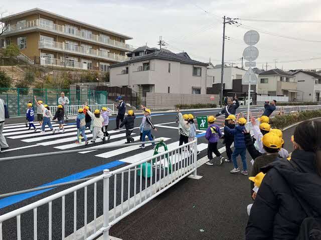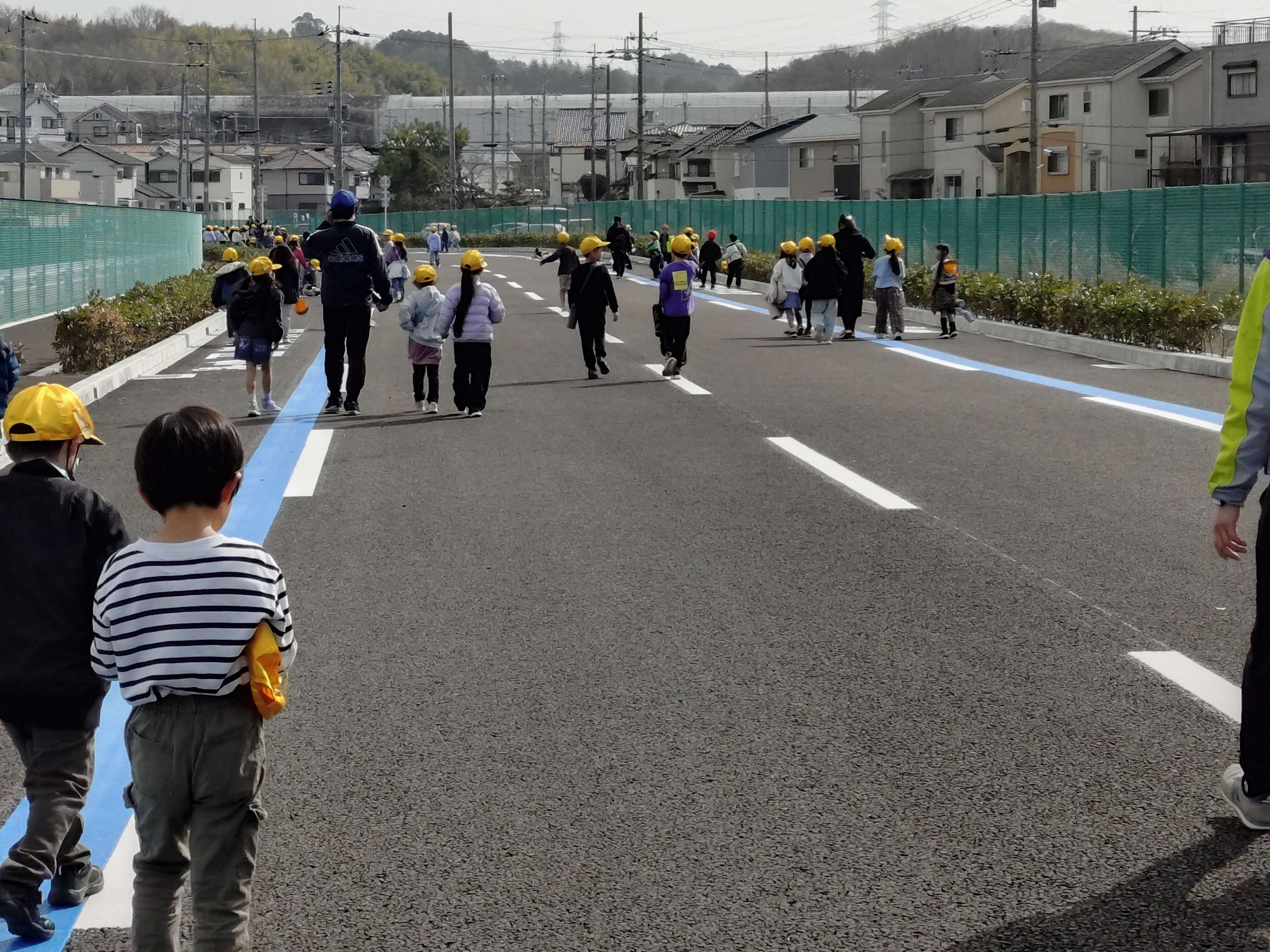 令和8年2月24日(火)、開通を控える牧野長尾線及び長尾杉線の大池区間に菅原東小学校の1年生に現場見学に来ていただきました。今回、未供用区間を特別に開放し、横断歩道や自転車の交通ルールを説明した後、横断歩道を実際に渡ってもらい、交通安全の意識を高める取り組みを行いました。