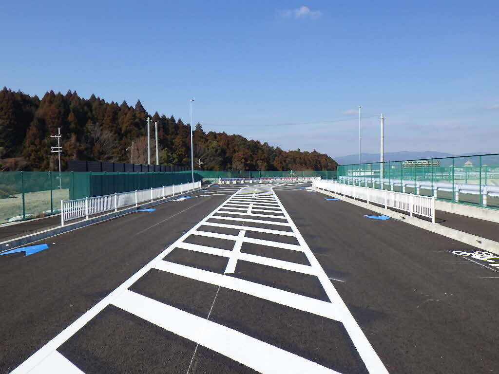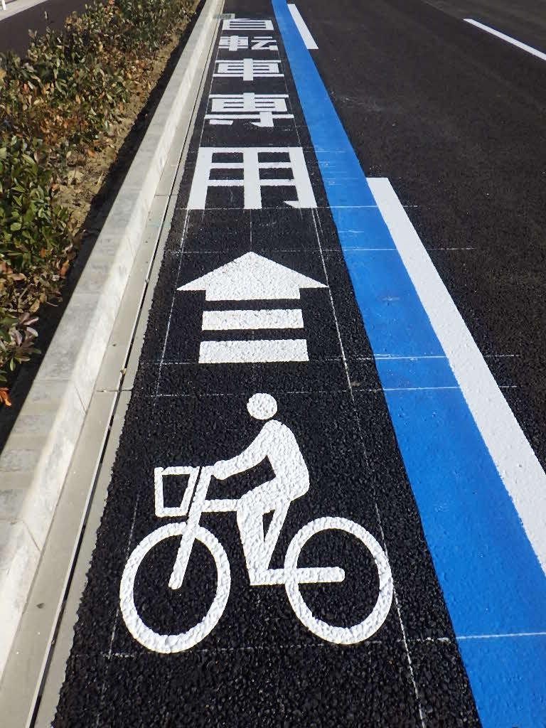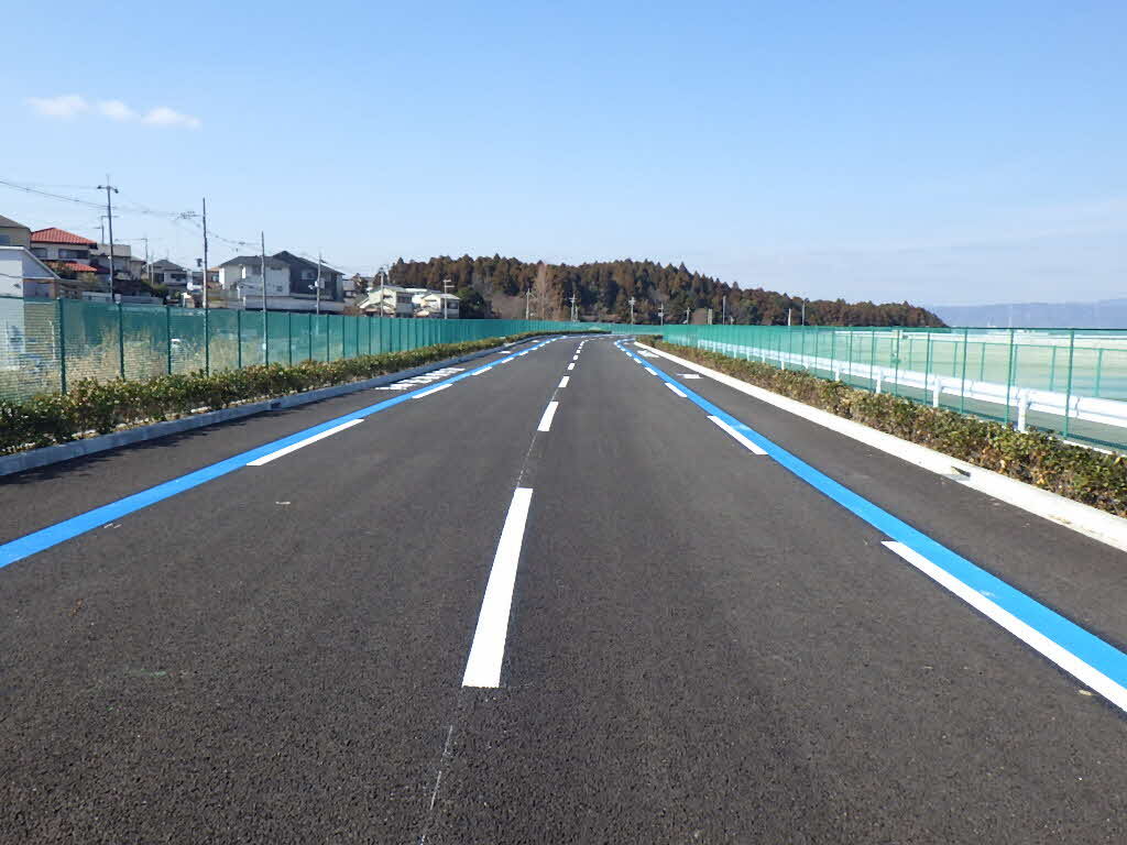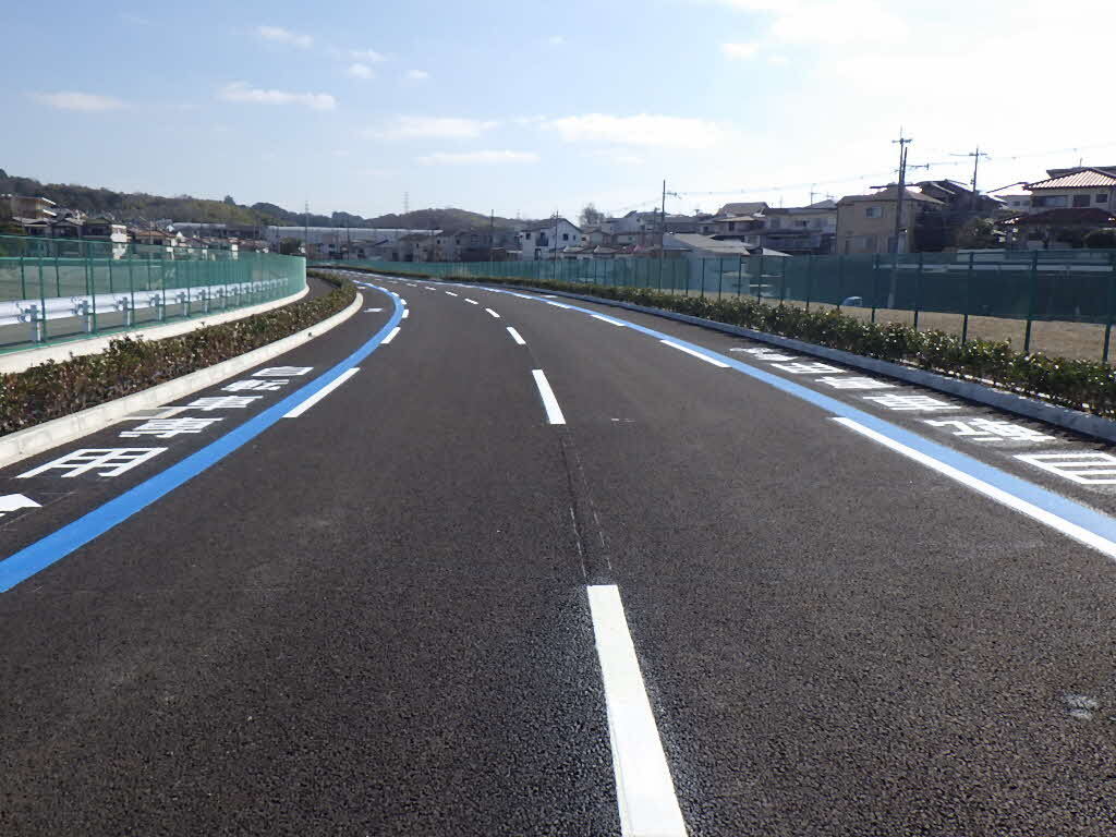 また、本供用区間全体(曲線部、交差点部を除く)に、普通自転車専用通行帯の規制がありますので、自転車は進行方向に向かって左側の通行帯を通行してください。