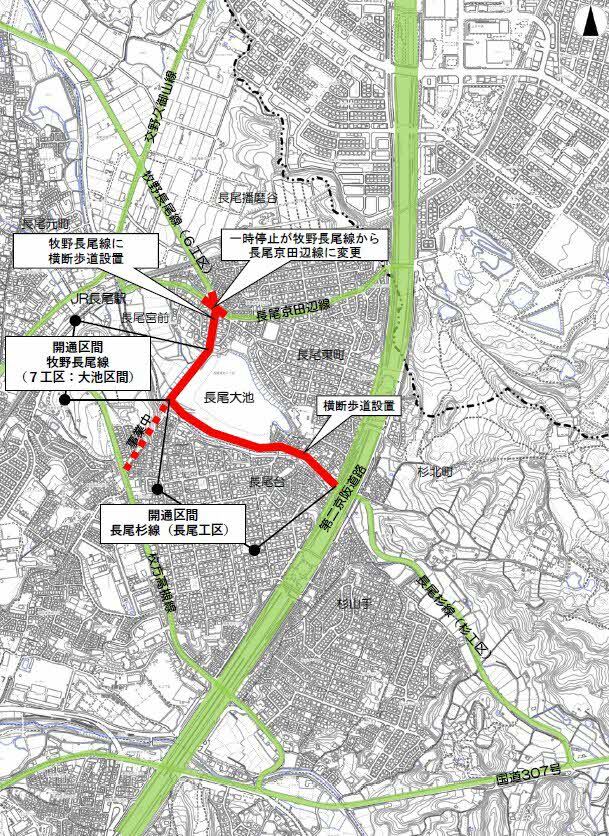 また、牧野長尾線に一時停止規制がかかっていましたが、牧野長尾線が主道路となるため、長尾京田辺線に一時停止規制が変更します。交通量の少ない段階からドライバーの皆様に慣れていただくため、開通前の2月中旬から規制を変更する予定です。詳しくは別添「牧野長尾線(7工区)及び長尾杉線(長尾工区)の開通に伴う交通規制の変更等について」をご確認ください。
