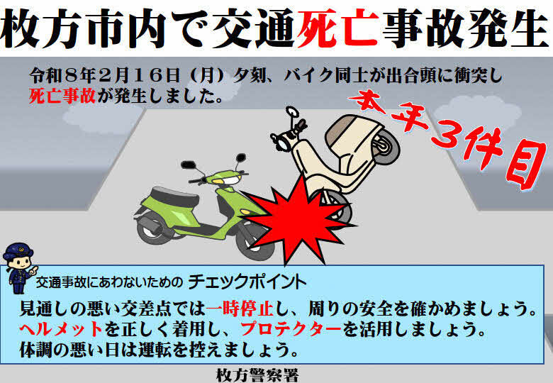 令和8年2月16日(月曜日)に、枚方市内で交通死亡事故が発生しました。