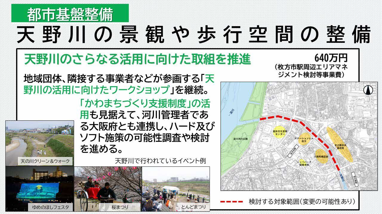 重要な地域資源であり、さまざまなイベントも行われている天野川の活用に向けては、令和7年度から大阪府とともに開催している地元自治会や天野川で活動する地域団体・事業者などが参画する「天野川の活用に向けたワークショップ」を継続し、ここでの提案などを踏まえつつ、国の制度である「かわまちづくり支援制度」の活用も見据えて、河川管理者である大阪府とも連携しながら、ハード・ソフト両面において、エリアマネジメントの実現も視野に入れ、本格的に検討を進めます。
