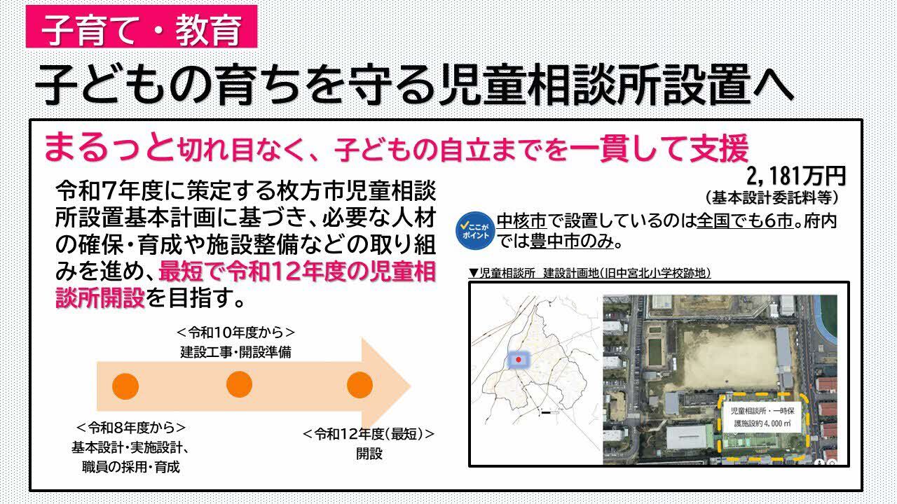 令和7年度に策定する枚方市児童相談所設置基本計画に基づき、令和8年度は他の児童相談所設置自治体への職員派遣や、必要な人材の確保・育成、施設整備などの取り組みを進め、最短で令和12年度に旧中宮北小学校跡地での児童相談所開設を目指します。なお、現在、中核市で児童相談所を設置しているのは全国でも6市で、府内では豊中市のみとなっています。