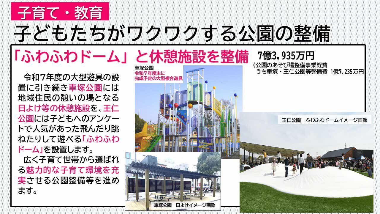 令和7年度の大型遊具の設置に引き続き、車塚公園には地域住民の憩いの場となる日よけ等の休憩施設を、王仁公園には子どもへのアンケートで人気があった飛んだり跳ねたりして遊べる「ふわふわドーム」を設置します。広く子育て世帯から選ばれる魅力的な環境を充実させる公園整備等を進めます。こうした取り組みを通じて、子どもたちが屋外でのびのびと遊び、家族や地域の人が自然に集い、交流が生まれる遊び場づくりを進めていきます。