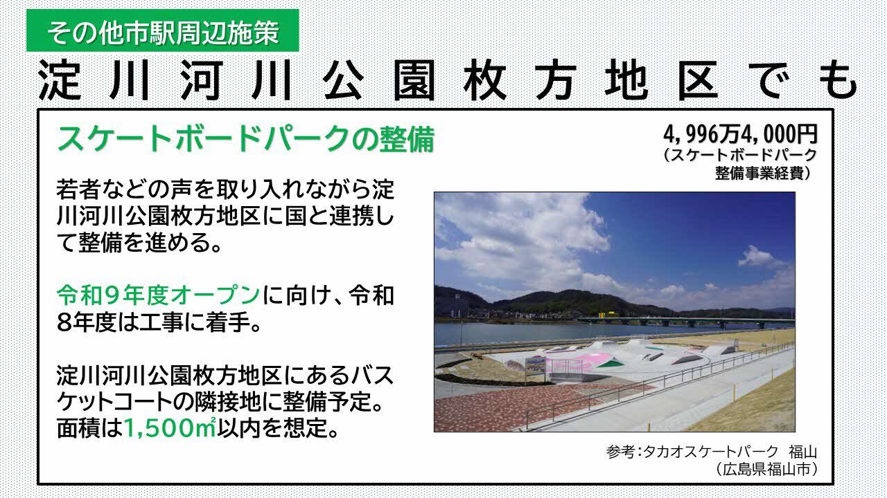 もう一つの重要な地域資源である淀川周辺では、アーバンスポーツの充実を図ることを目的に、スケートボードパークを整備します。若者などの声を取り入れながら、淀川河川公園枚方地区に国と連携して整備を進めます。令和9年度オープンに向け、現在、公募型プロポーザルによる事業者選定を終え、令和7年度中に契約を締結し、令和8年度は工事に着手する予定です。バスケットコートの隣接地に整備予定で、面積は1,500平方メートル以内を想定しております。