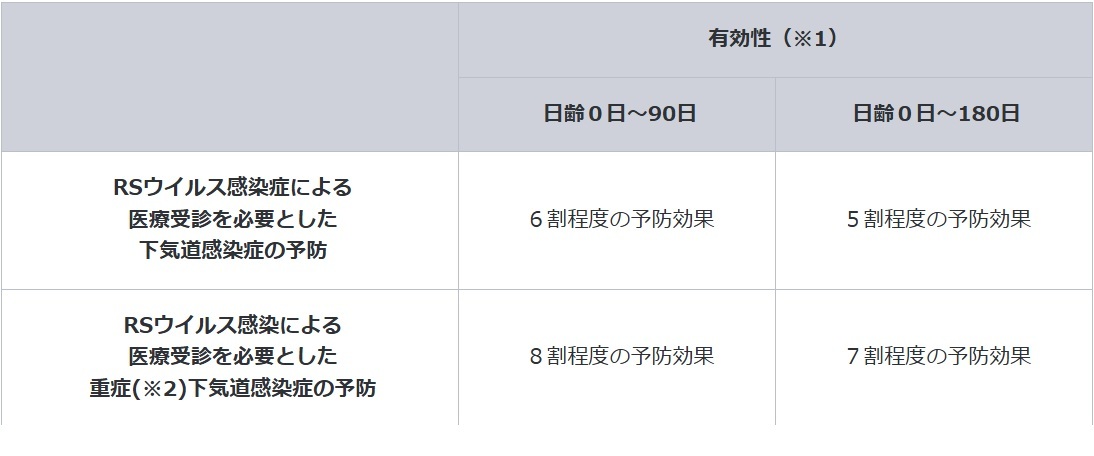 妊婦の方が妊娠中に接種することにより、出生後の乳幼児のRSウイルス感染による下気道感染症(肺炎・気管支炎等)に対する予防効果が認められています。