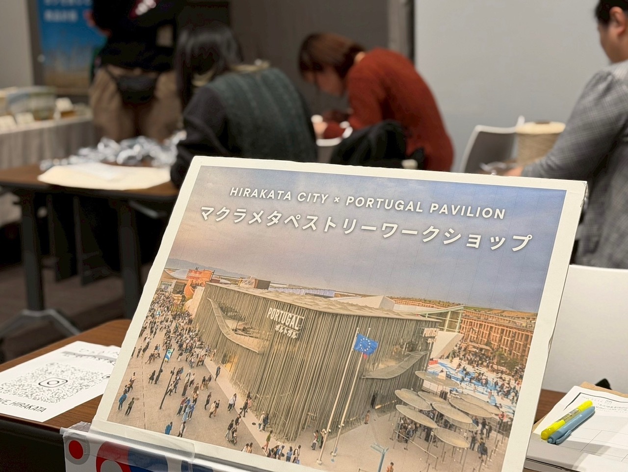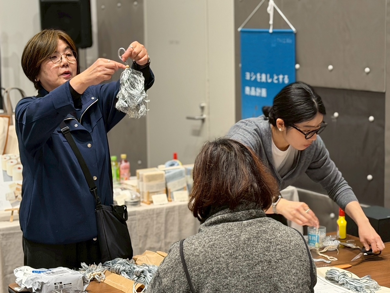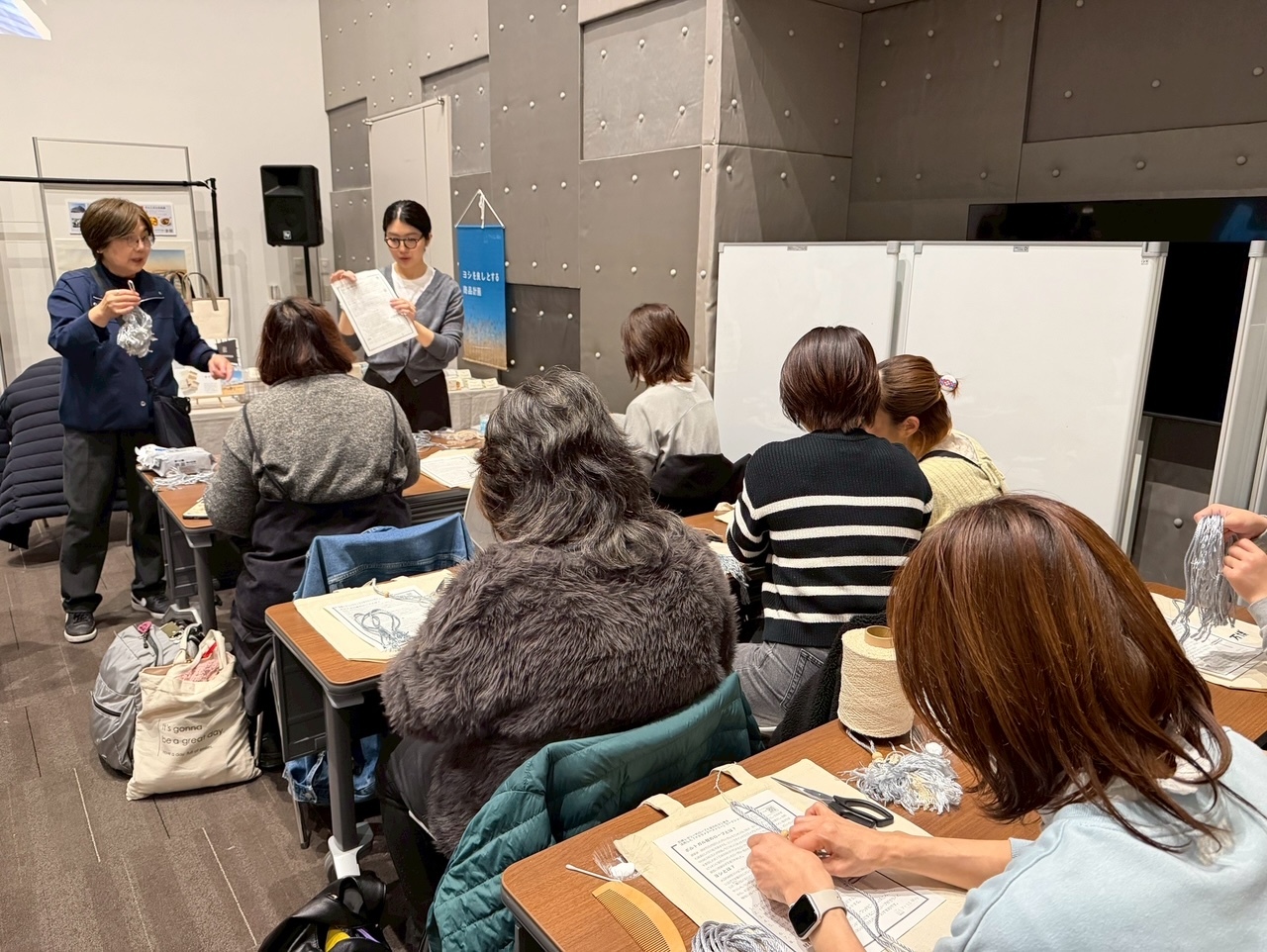 本市は3月8日(日)に出展し、大阪・関西万博のポルトガルパビリオンで使用後に市に寄贈(別ウインドウで開く)されたロープと、枚方を流れる淀川に自生するヨシから生成したヨシ糸を織り交ぜて「マクラメタペストリー」を制作するワークショップを開催しました。