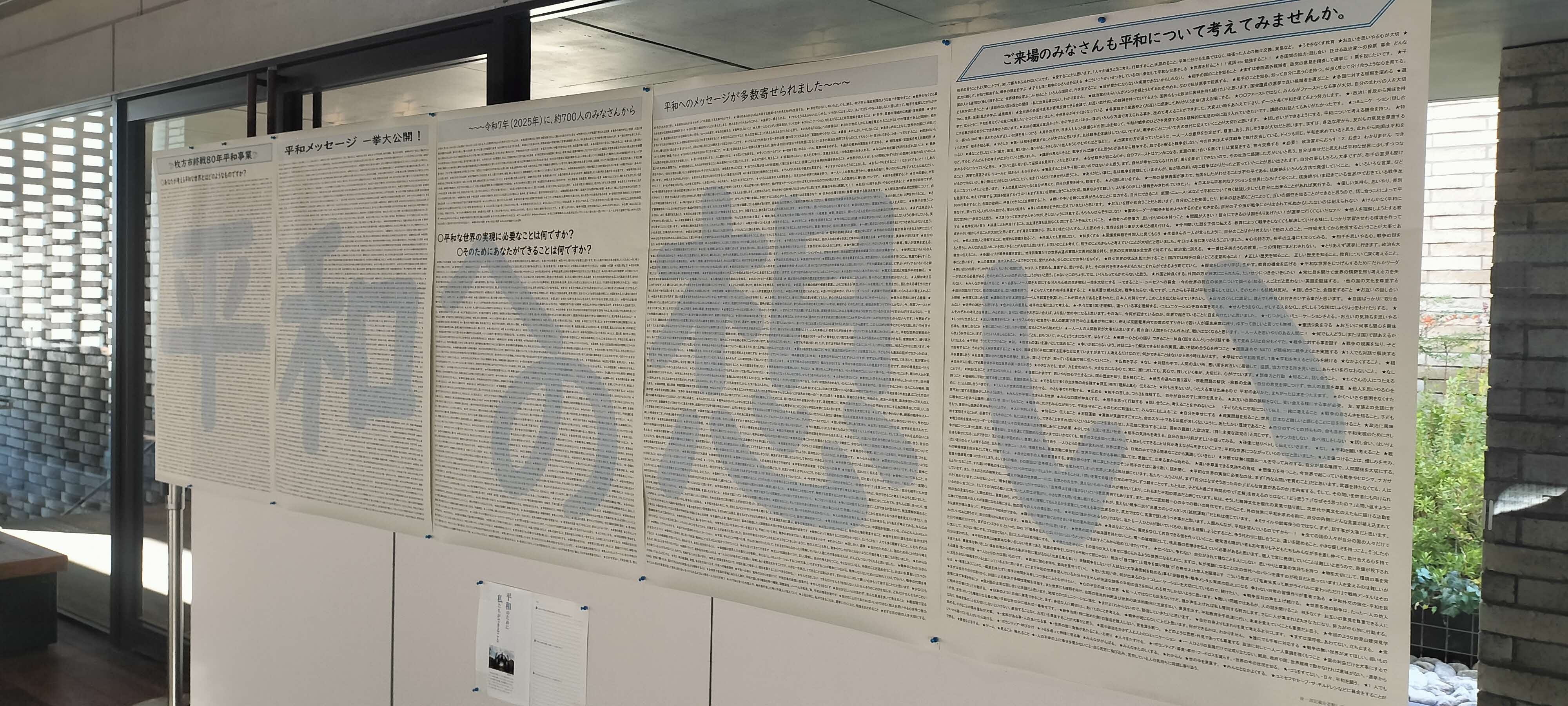 2025(令和7)年は終戦から80年の節目の年でした。戦争を知る人、体験した人が少なくなる中、改めて、戦争の悲惨さや平和の尊さについて考えていただくため、枚方市では、市民の皆さん一人ひとりが考える平和メッセージを募集しました。