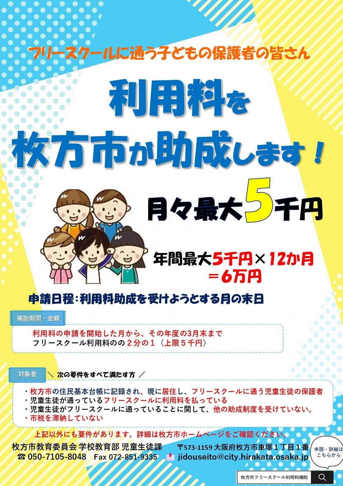 フリースクールに通う子どもの保護者の皆さん 利用料を最大6万円補助します!