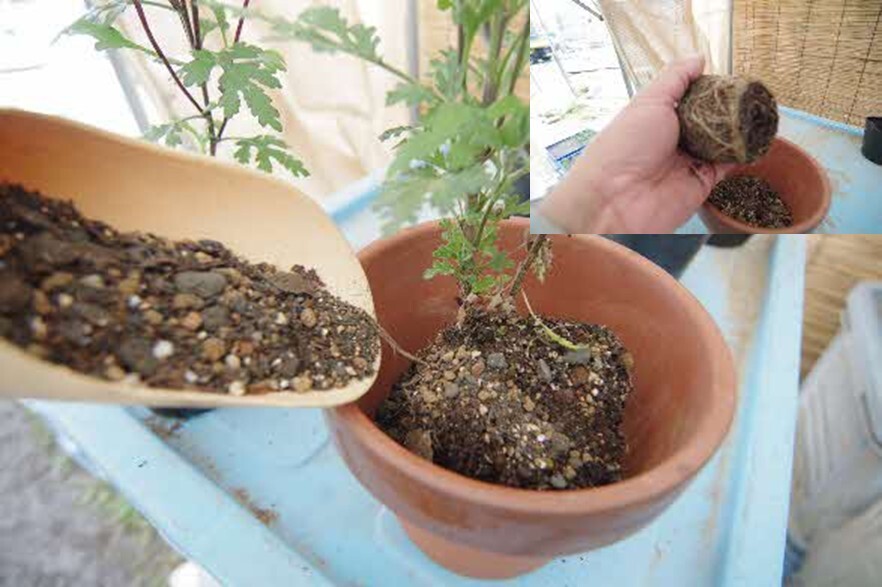 3号ポットから取り出した菊苗を