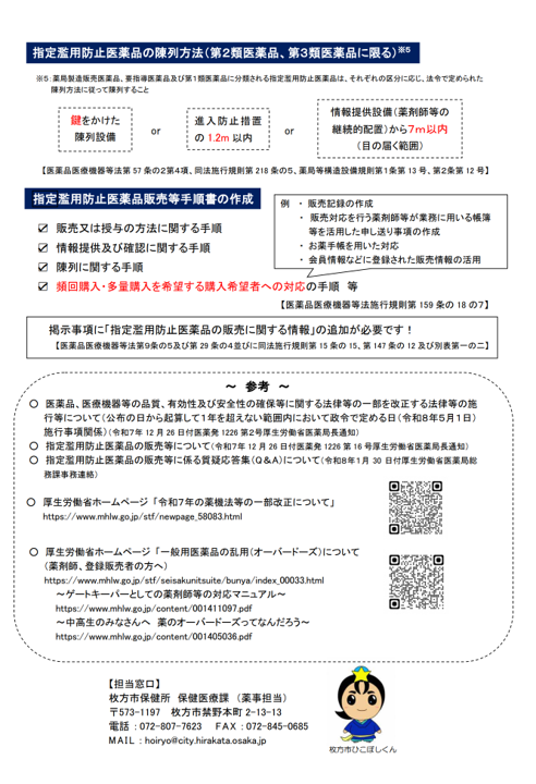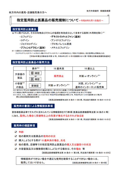 薬局・店舗販売業の方向け「指定濫用防止医薬品の販売規制について」(令和8年5月1日施行)を参考に、関係法令をよくご確認のうえ、改正法に従った適切な販売対応を行っていただくようお願いいたします。