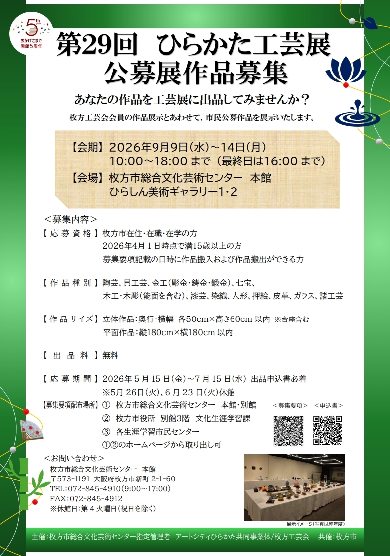 本展では、枚方工芸会会員による作品展示とあわせて、市民公募による作品を募集します。