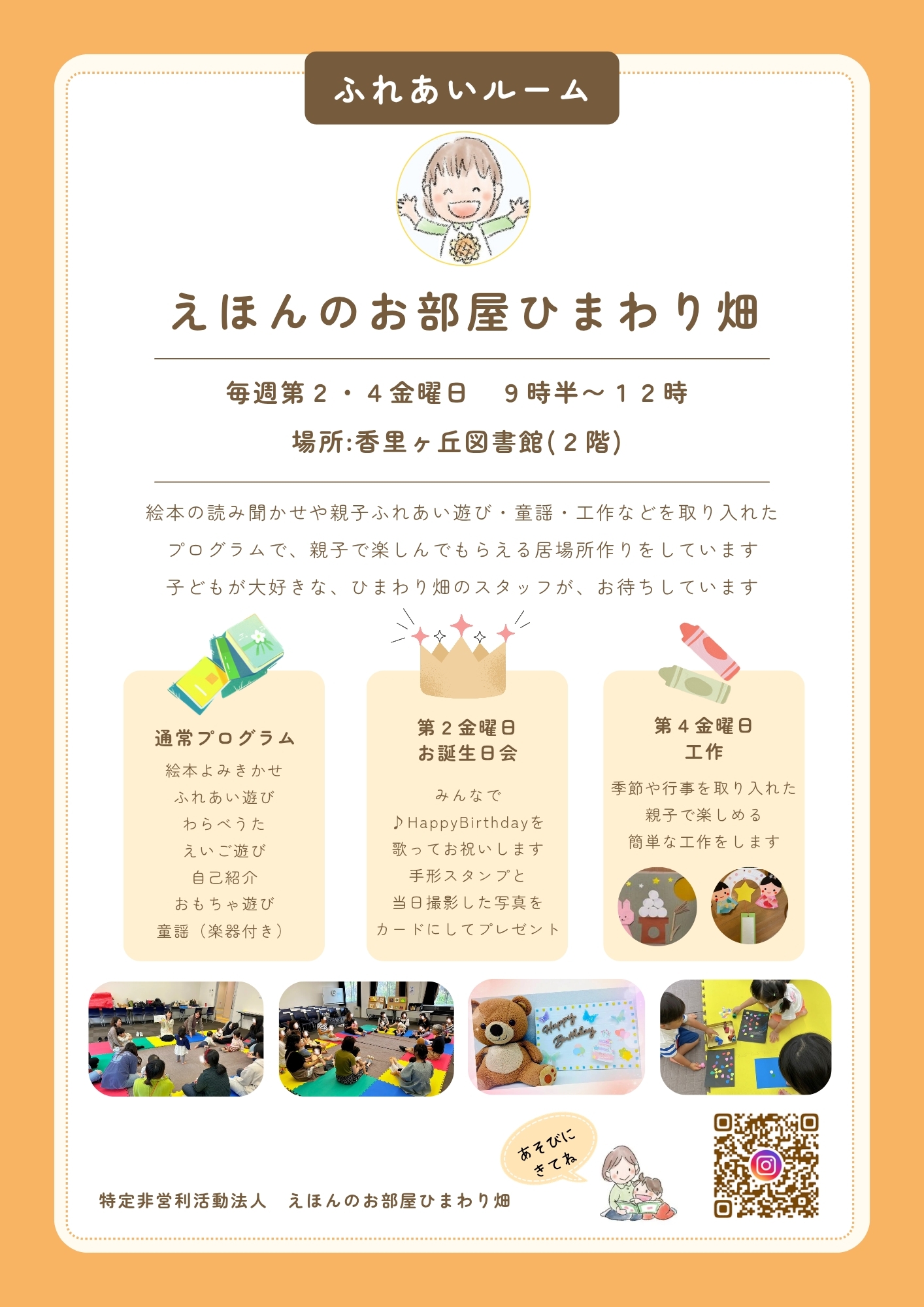 | 香里ケ丘図書館 | えほんのお部屋ひまわり畑 チラシ(JPEG画像形式、788.30KB) | 第2・4金曜 (9時30分~12時) | 4月:10日・24日 5月:8日・22日 6月:12日・26日 |