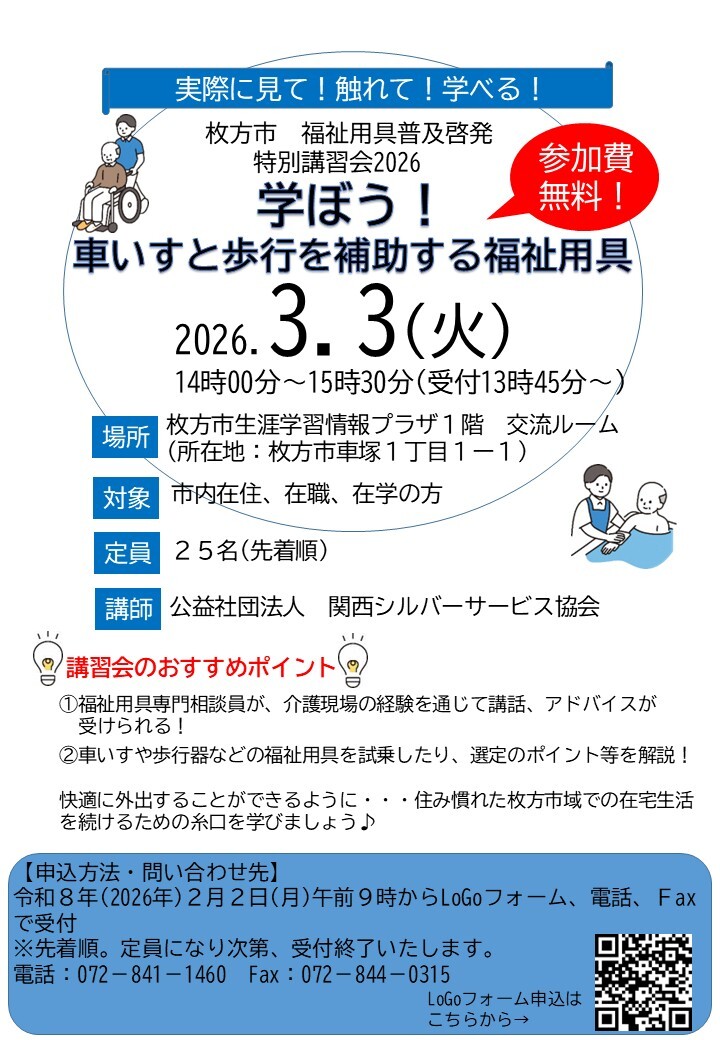 令和8年2月2日(月)午前9時から申込フォーム(別ウインドウで開く)または電話・ファクス(氏名・電話番号、講習会名を明記)で介護認定給付課へ(電話番号072-841-1460、ファクス番号072-844-0315)お申し込みください。