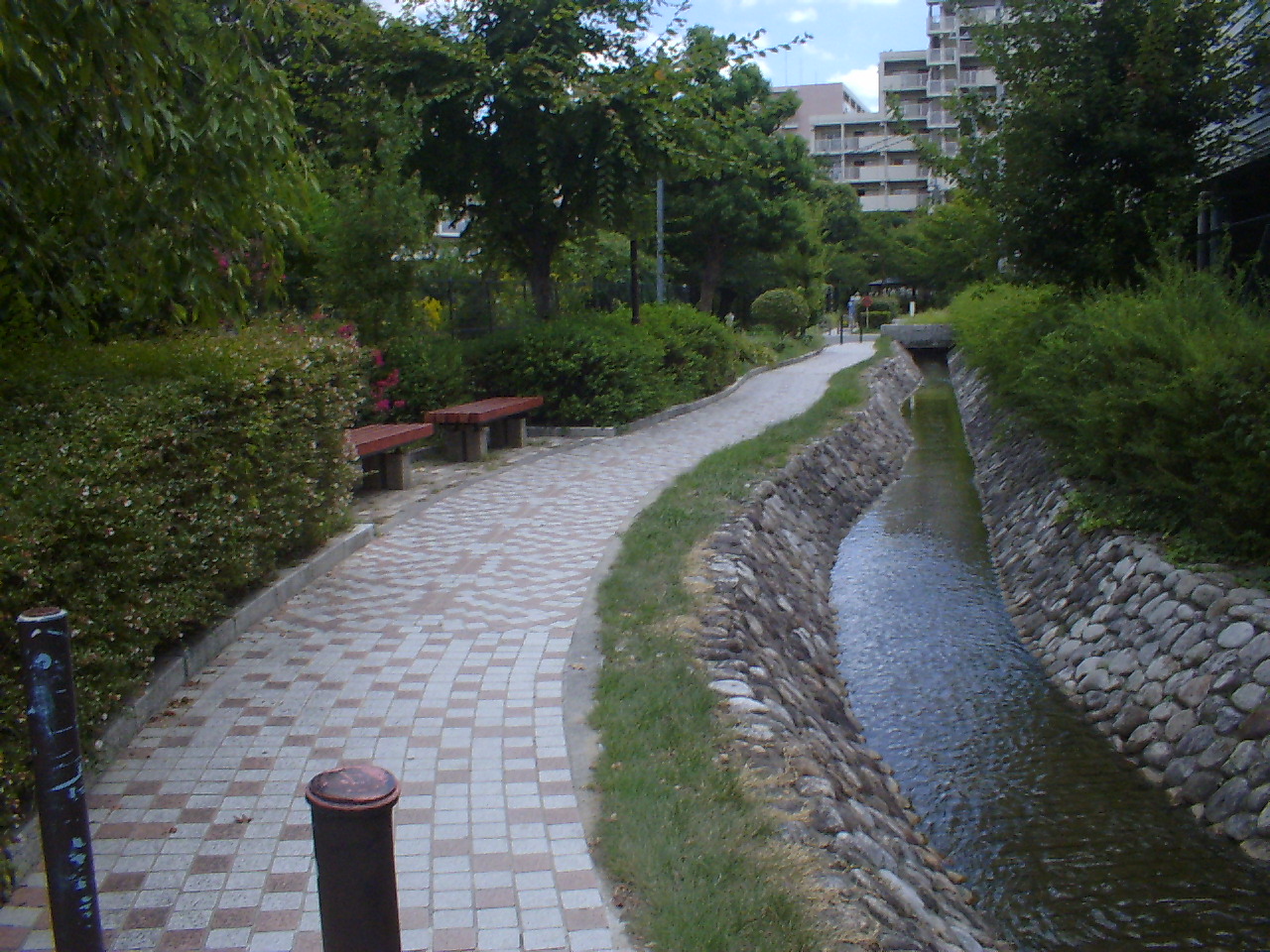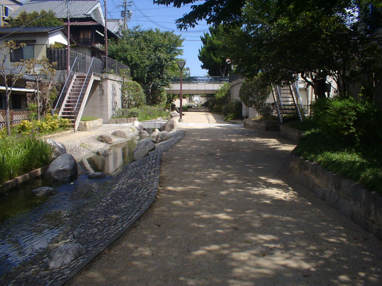 水緑景観モデル事業の一環として、香里団地のほぼ中央を流れていた水路にふたをし、その上にこもれび水路や遊歩道などを設け、人と人とのふれあいの場や子供たちの水遊びの場を創造しました。