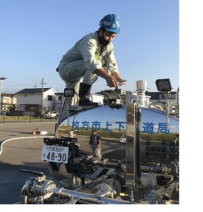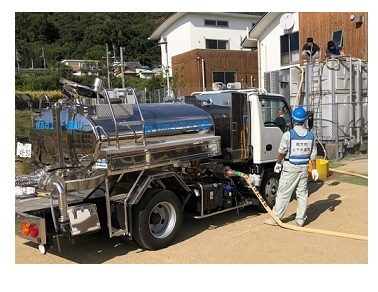 要請を受け、枚方市は10月4日(月)より連日上下水道局職員3名、給水車(容量1600リットル)1台を派遣し、小学校や保育施設、福祉施設の受水槽への給水や和歌山市民への給水活動を行っています。