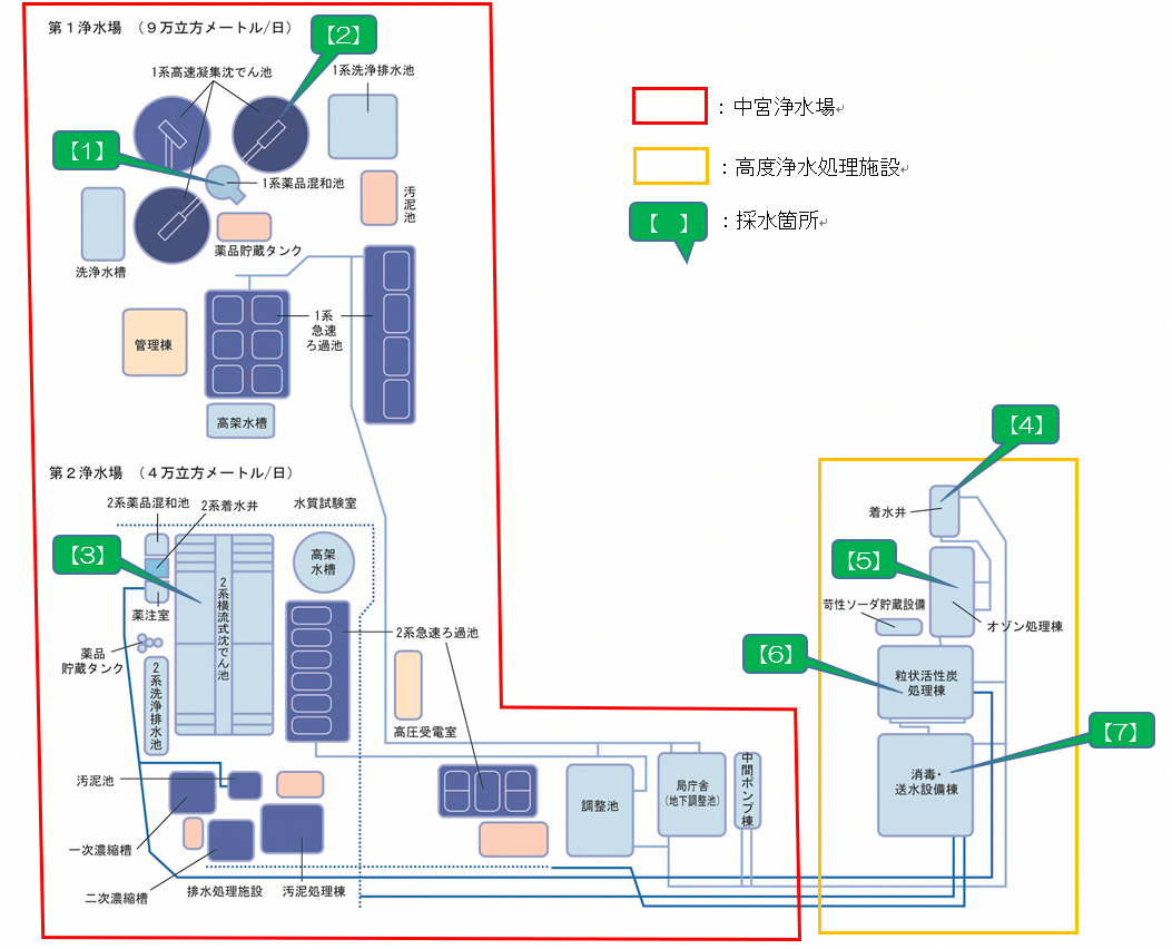 毎日行う採水箇所は、【1】原水(淀川の表流水)、【2】第一浄水場沈殿水、【3】第二浄水場沈殿水、【4】砂ろ過水、【5】オゾン処理水、【6】粒状活性炭処理水、【7】浄水(水道水)です。検査項目は、濁度・色度・臭気・味・pH値・電気伝導率・アルカリ度・一般細菌・大腸菌・アンモニア態窒素・塩素要求量・溶存酸素・BOD・過マンガン酸カリウム消費量・全有機炭素・UV・残留塩素などで、処理工程ごとに必要な項目を検査し評価します。