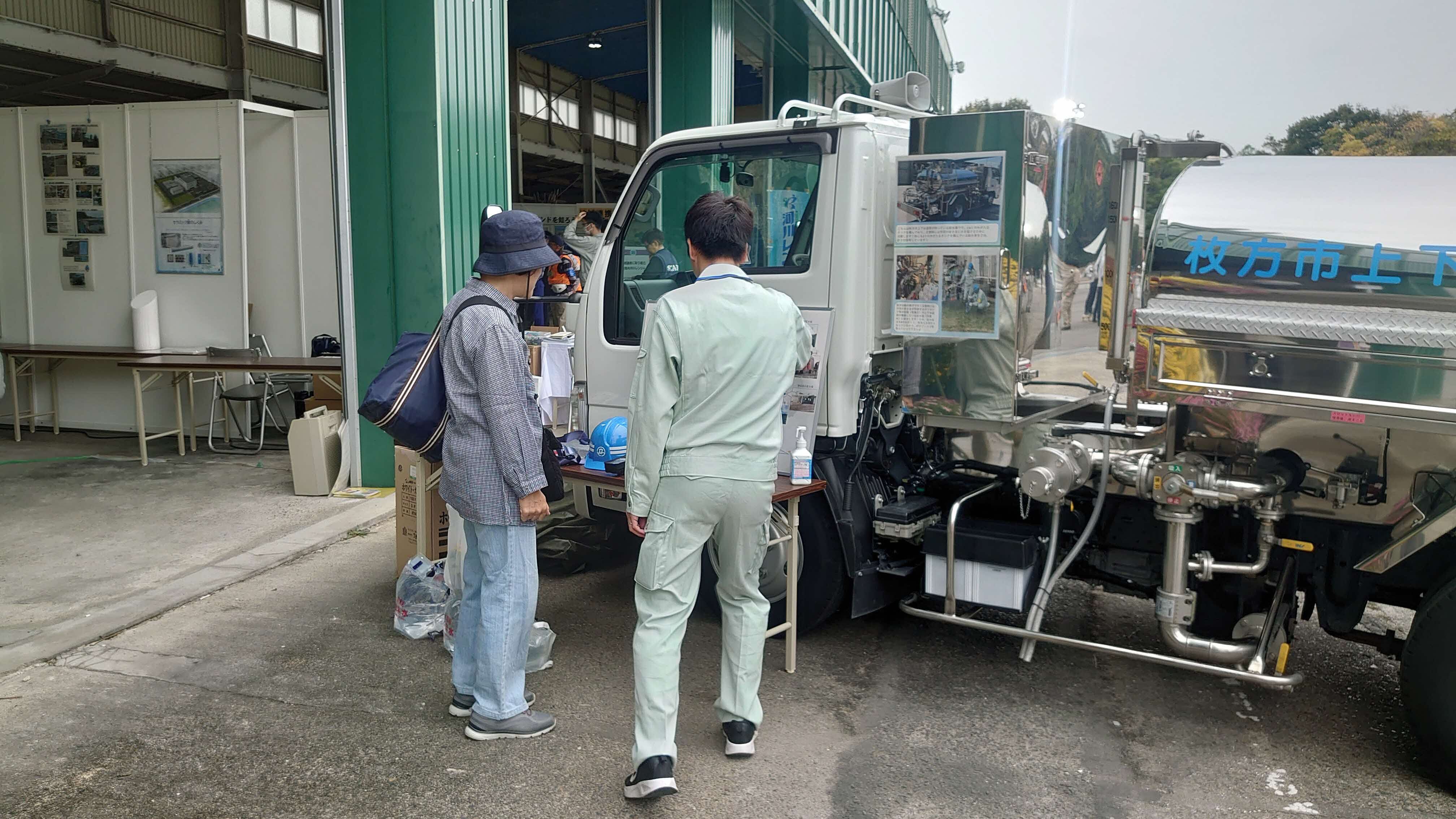 当日は、「おいしい枚方の水」や「災害時の備え」について、小さい子どもから大人まで楽しみながら知ってもらうことを目的に、「利き水体験」や「給水車を活用した給水活動の実演」「安全・安心な枚方の水や給水活動に係るパネル展示」などを行いました。