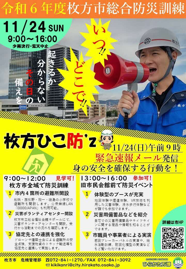 引き続き、枚方市上下水道局は、今週の11月24日(日)に開催される「令和6年度枚方市総合防災訓練『ひこ防z』」にも参加します(^^)/