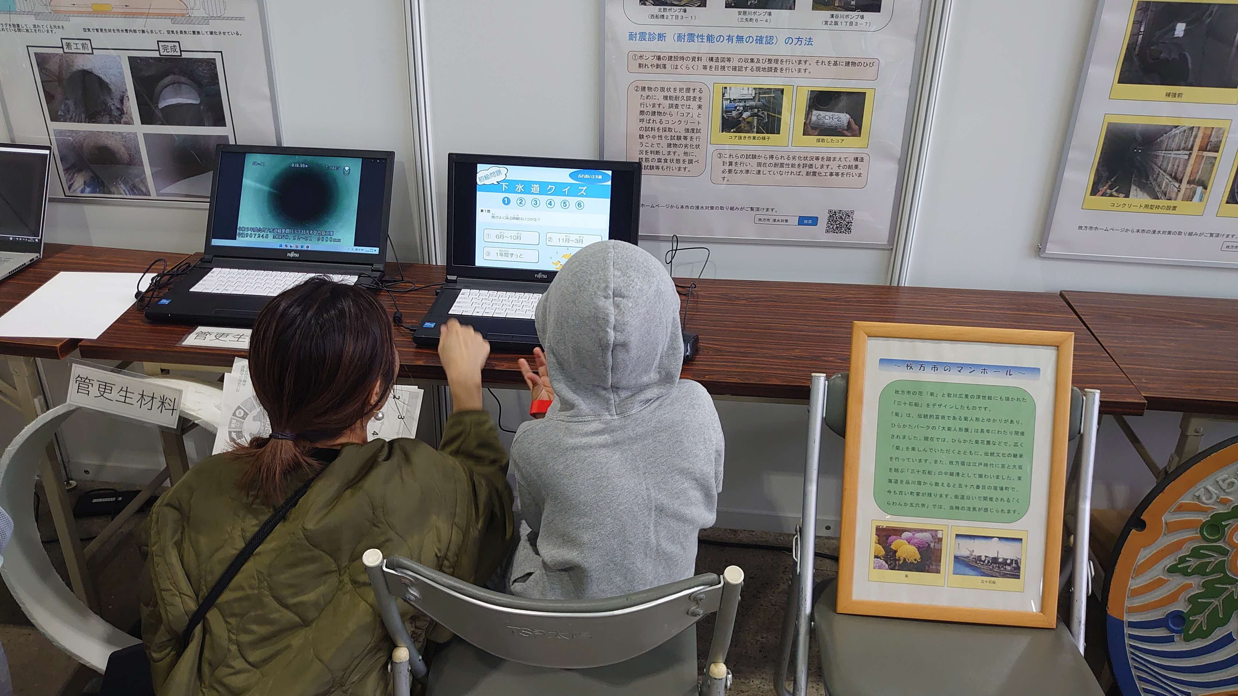 中でも、枚方市上下水道局のブースでは、能登半島地震での給水活動や漏水調査の活動記録、初期給水拠点についてのパネル展示、また、中宮浄水場更新事業についてのパネルや模型の展示、下水道クイズなどを通して、私たちの生活になくてはならない上下水道について、改めて多くの方に知ってもらい、考えてもらう機会とすることができました。