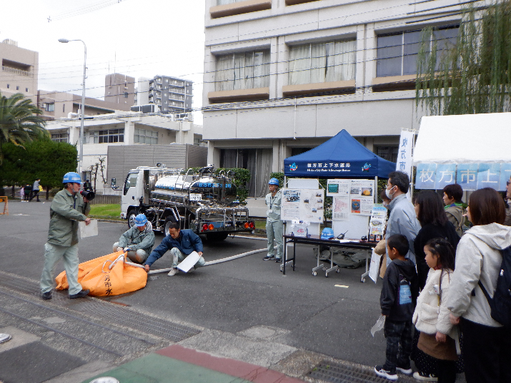 今回、枚方市上下水道局が出展したブースでは、普段なかなかお目にかからない給水車との記念撮影や、給水車による給水活動の体験、また、土のうステーションの展示や土のうによる浸水対策のパネル展示を行いました。