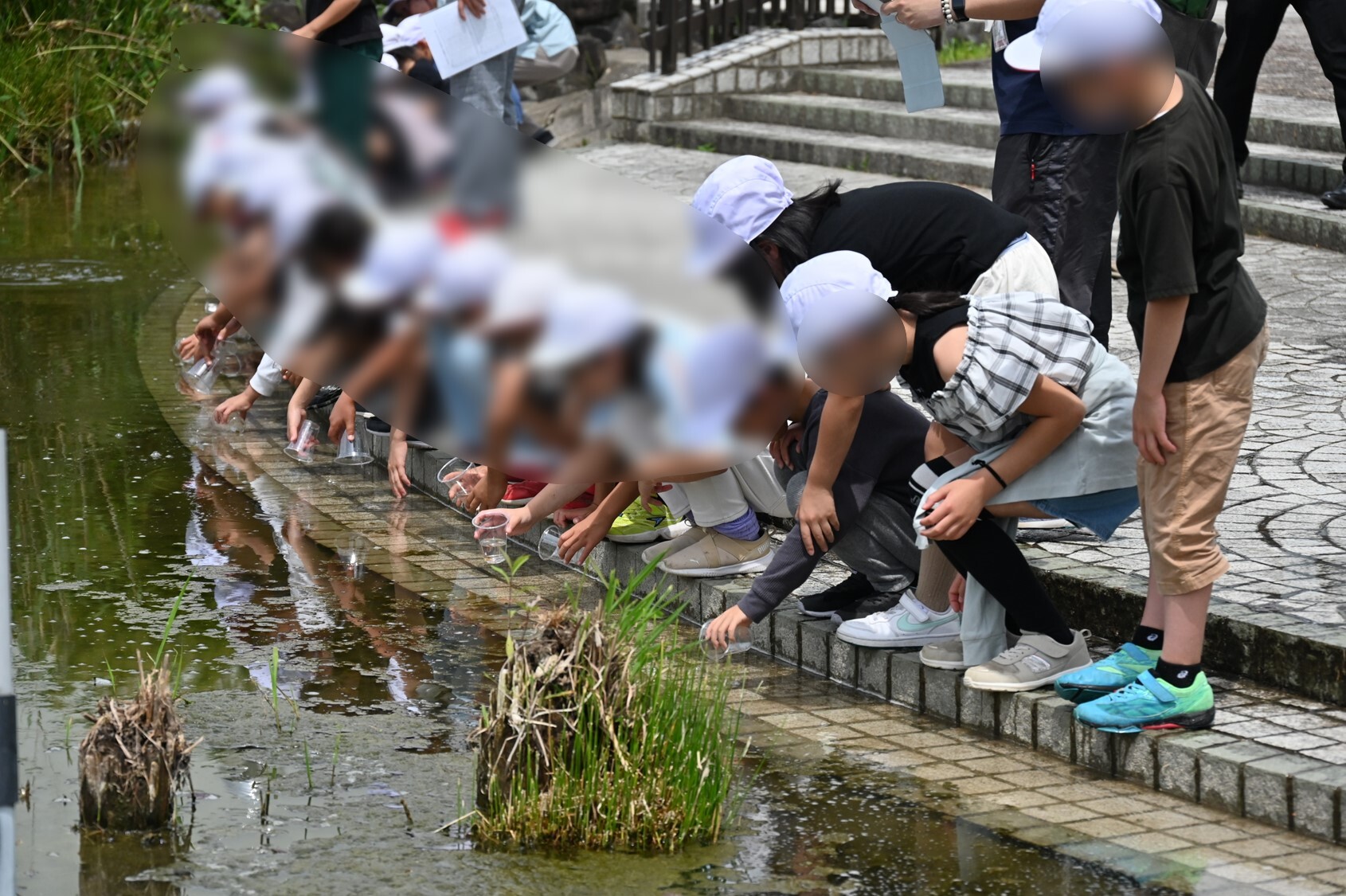 このイベントは、水のある環境や命の大切さを学んでもらうために毎年開催されているもので、市内小学校協力のもと、プール清掃で流されてしまうヤゴを救出し、高度処理水を利用した池に放流するものです。